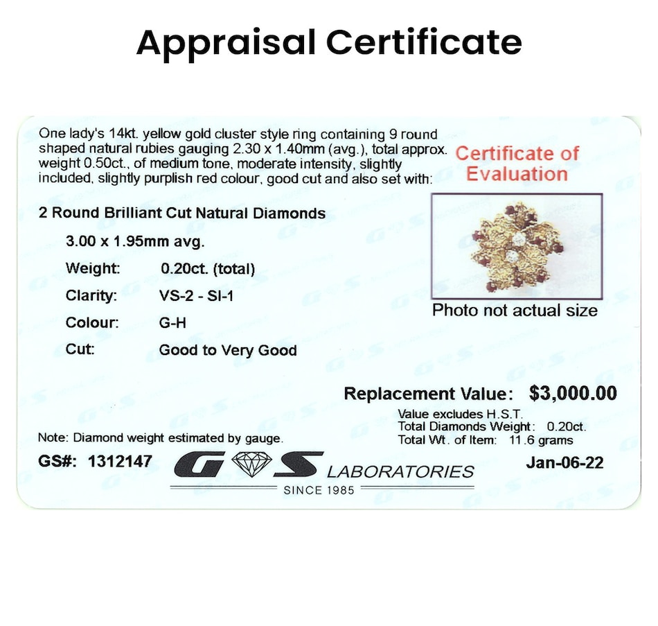 • Specs: (2) round brilliant cut diamonds (.20ctw), (9) round shaped rubies (.50ctw)