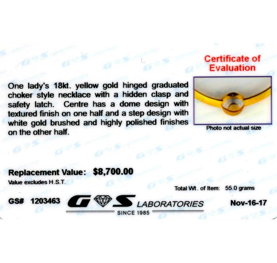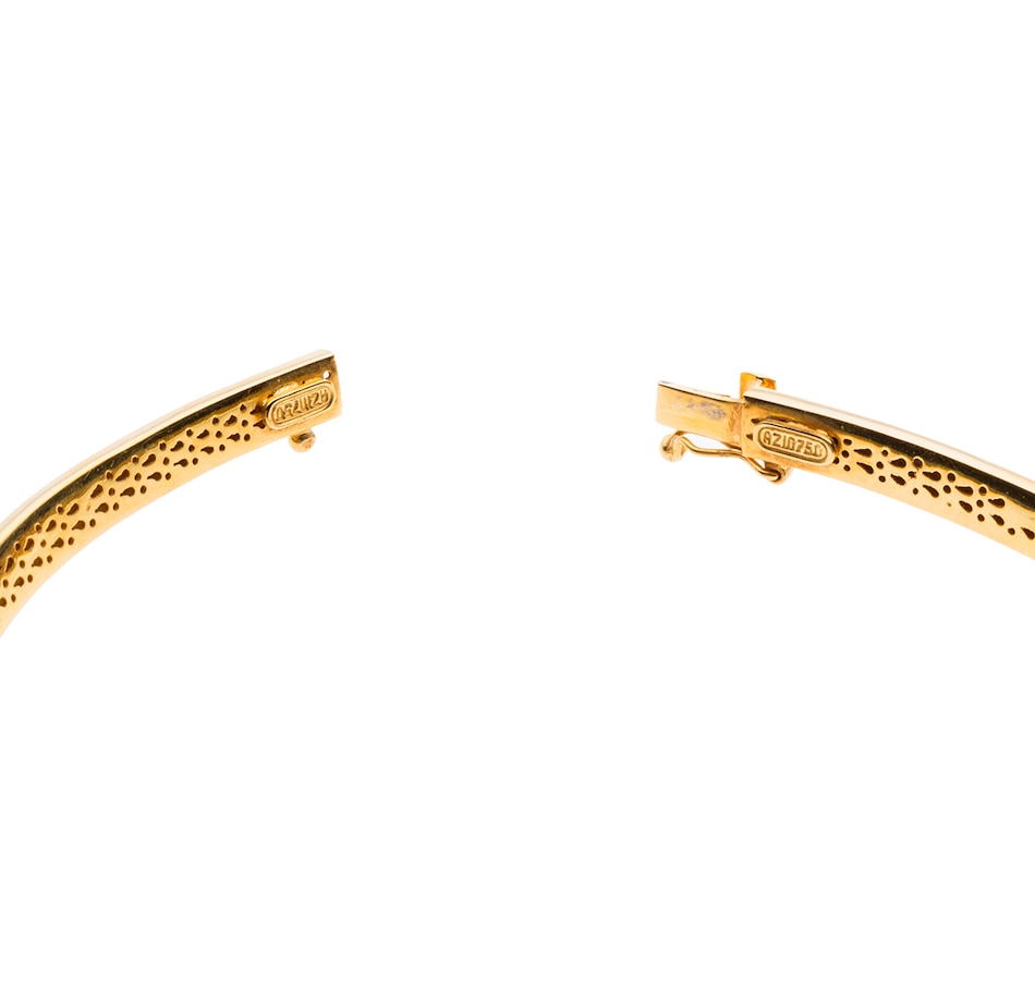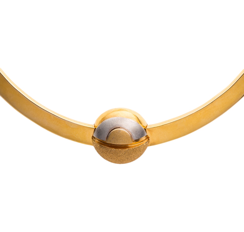 This designer hardwire choker-style necklace is crafted by the high-end jewellery manufacturer Azin, a company established in 1987 in Tehran, Iran by R.Hajilou. Synonymous with quality, this 18K two-tone bar graduated, hinged necklace is finished in a domed design centerpiece with texture on one half and a step design with brushed and high polish finish on the other. Wear this piece and reap the compliments!
