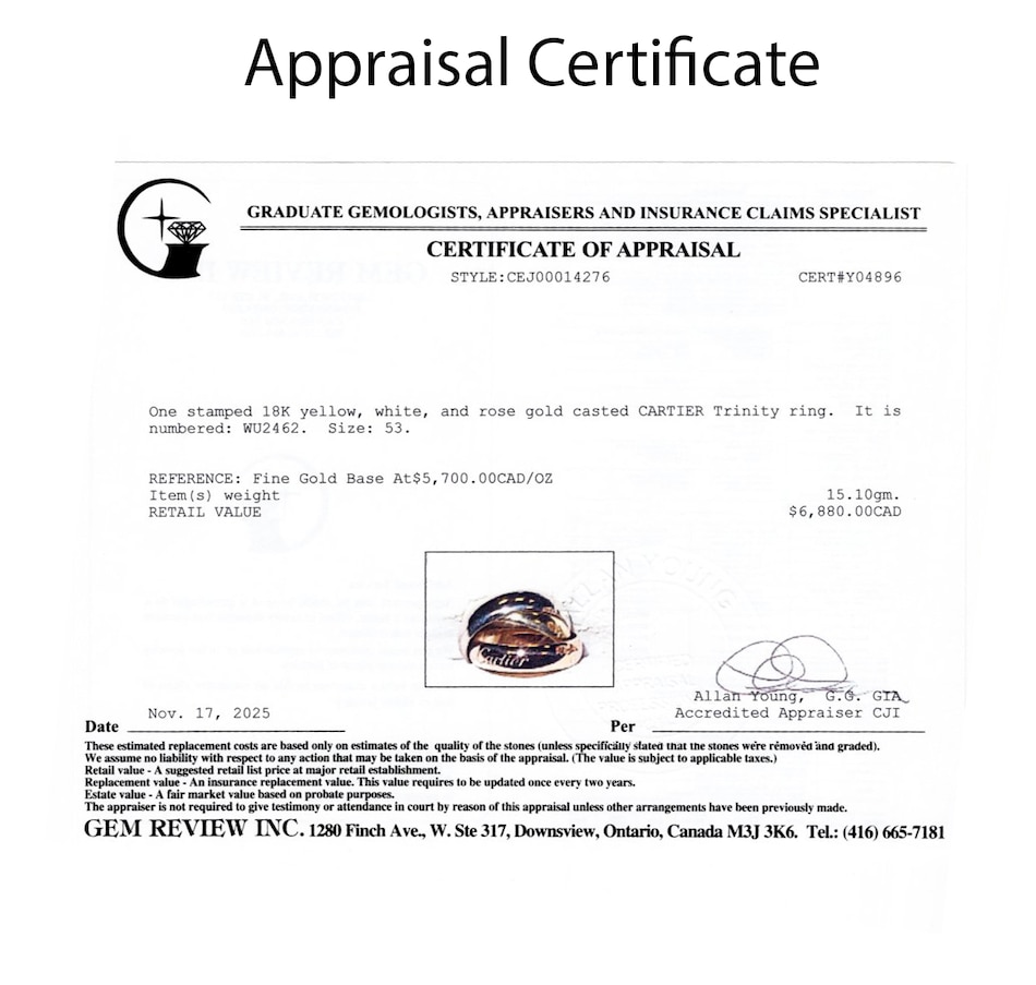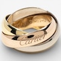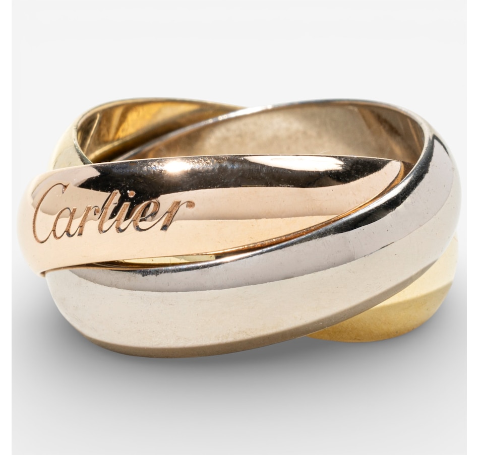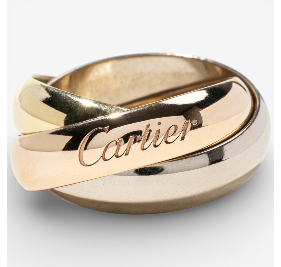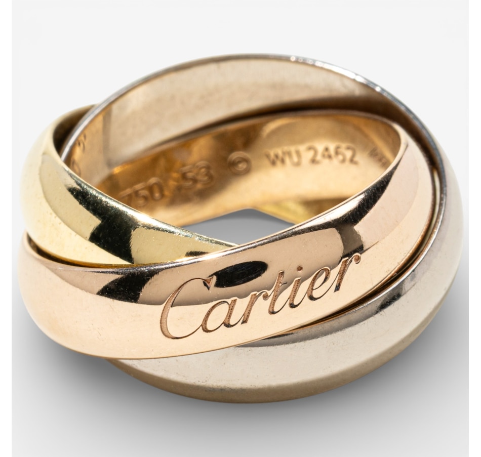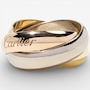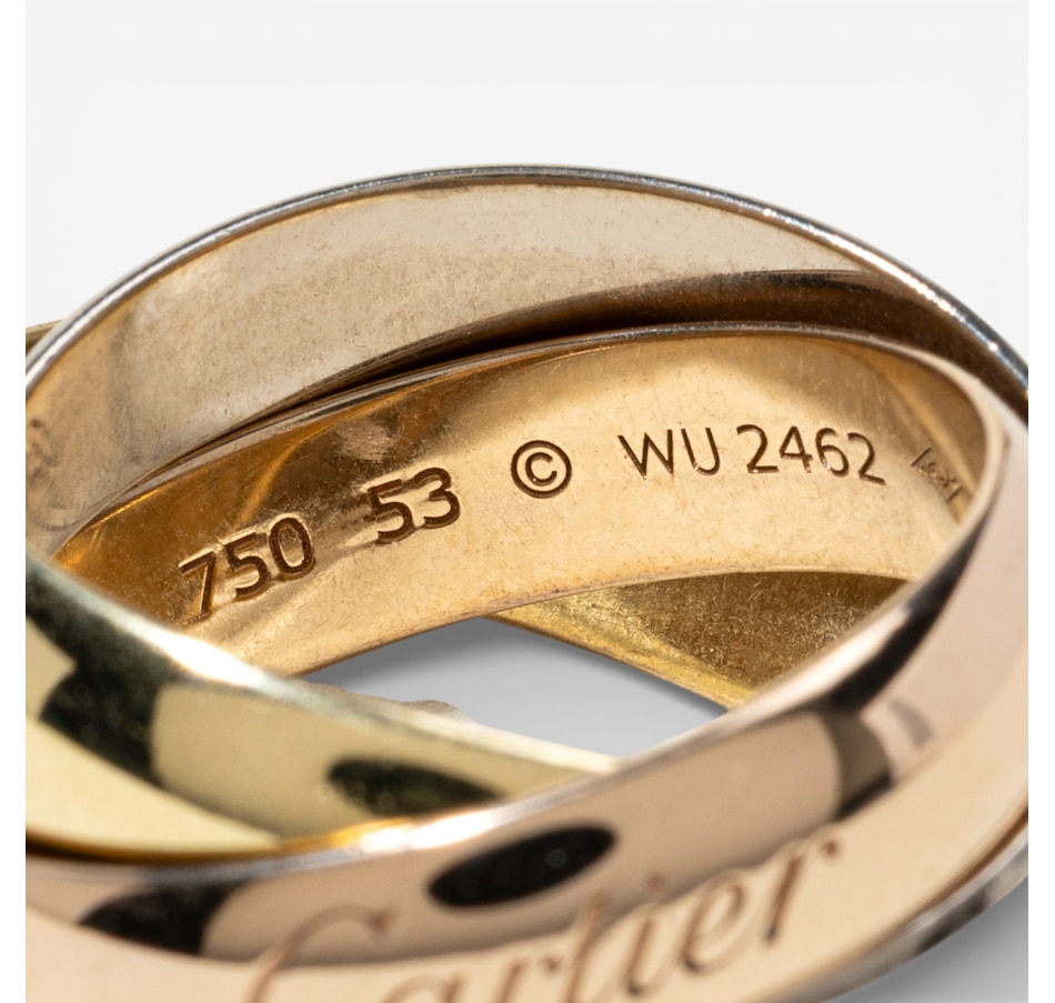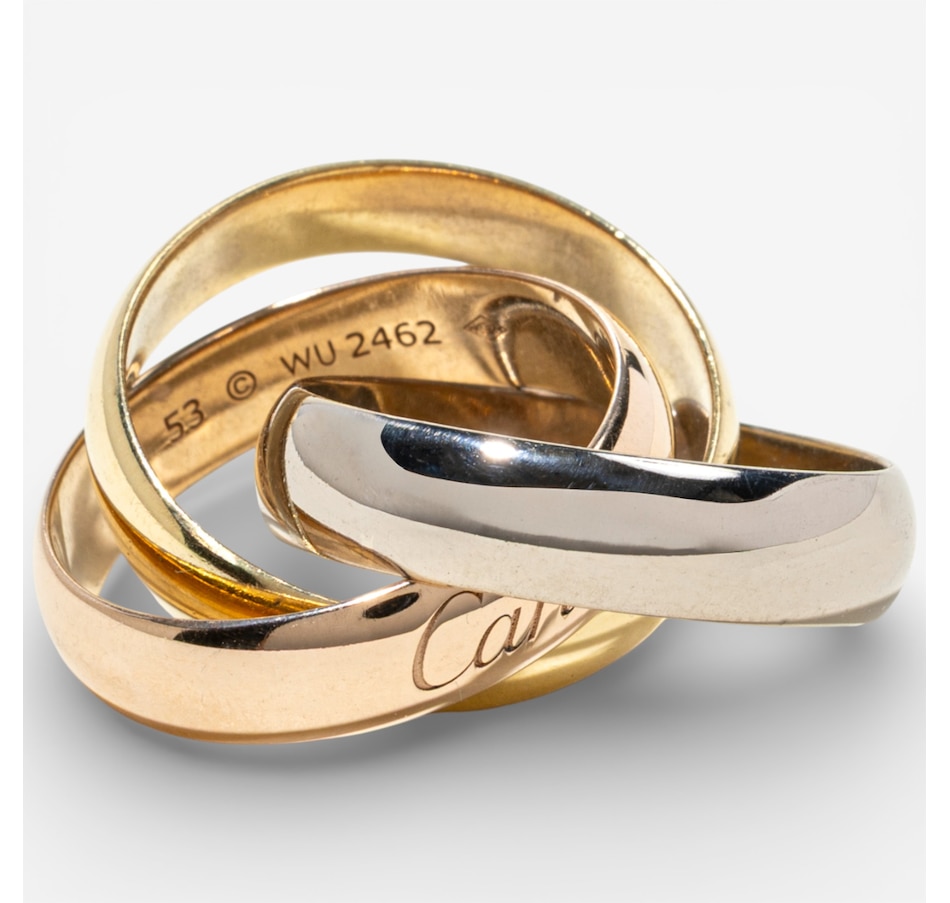 Timelessly elegant and endlessly iconic, this Cartier tri-colour rolling ring is a masterclass in refined design and symbolic beauty. Artfully composed of three interlaced curved bands, each 5-mm wide and crafted in rich yellow, white and rose gold, this signature piece represents unity, harmony and the intertwining of past, present and future. Known as the Trinity de Cartier, this design was first created in 1924 by Louis Cartier and has since become one of the maison’s most celebrated creations. Each gold band carries a poetic meaning: rose gold for love, yellow gold for fidelity and white gold for friendship. The bands glide seamlessly over one another, forming a fluid, sculptural whole that moves gracefully with the wearer. Crafted in France and hallmarked on the outside of the rose gold band with the Cartier signature and on the inside "750 53 WU2462."