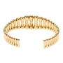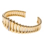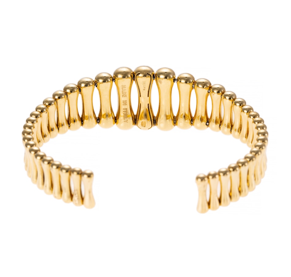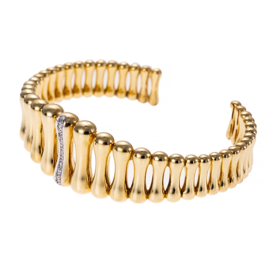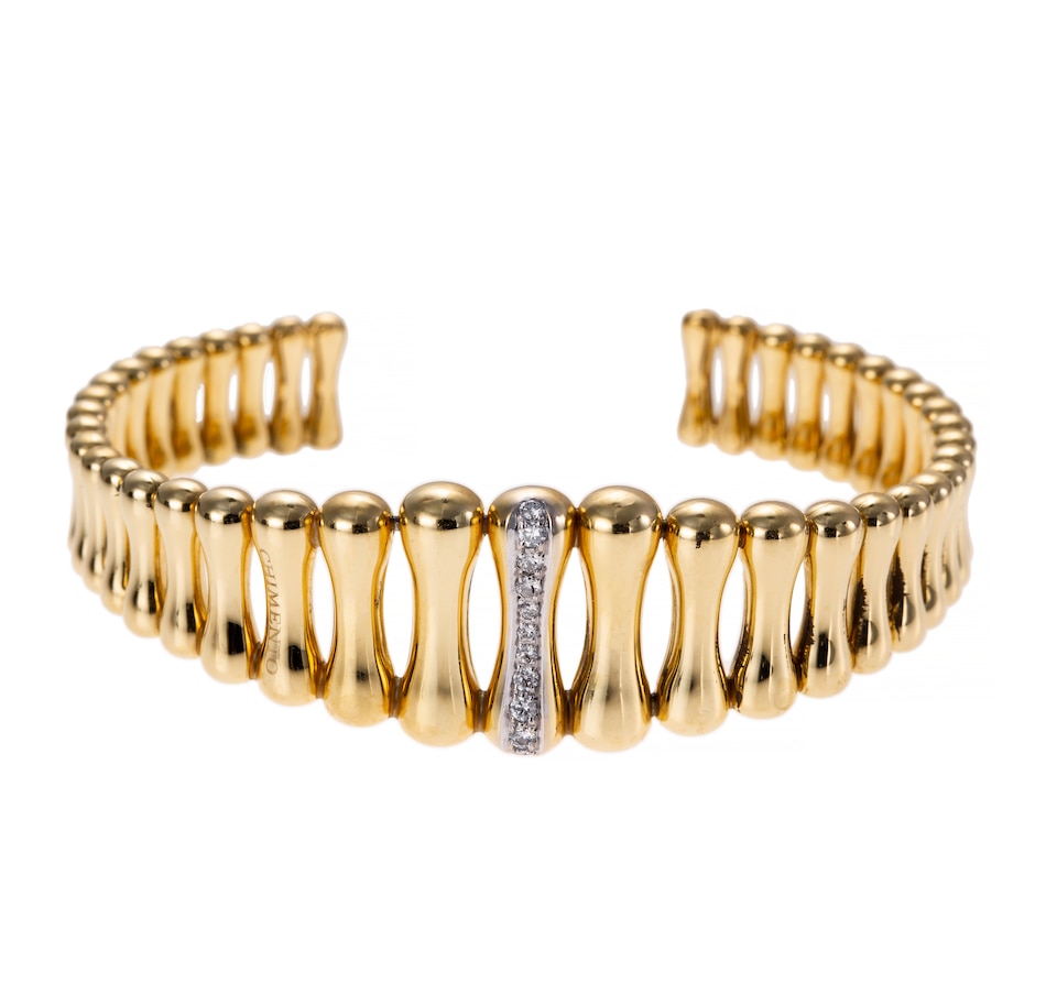 This unique cuff style bracelet is Italian made and crafted in exquisite 18K yellow gold. Graduating hourglass shaped columns span from each side of an open back, increasing in size as they progress towards the front, creating a sophisticated and dynamic visual effect. At the heart of this stunning piece is a center column which is prong-set, in white gold, with eleven round brilliant cut diamonds and a combined total of 0.24 carats. The combination of high-quality gold and the sparkling diamonds make this cuff bracelet a perfect statement piece for any occasion.