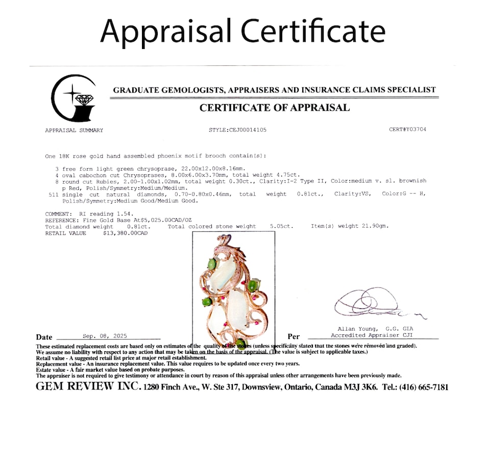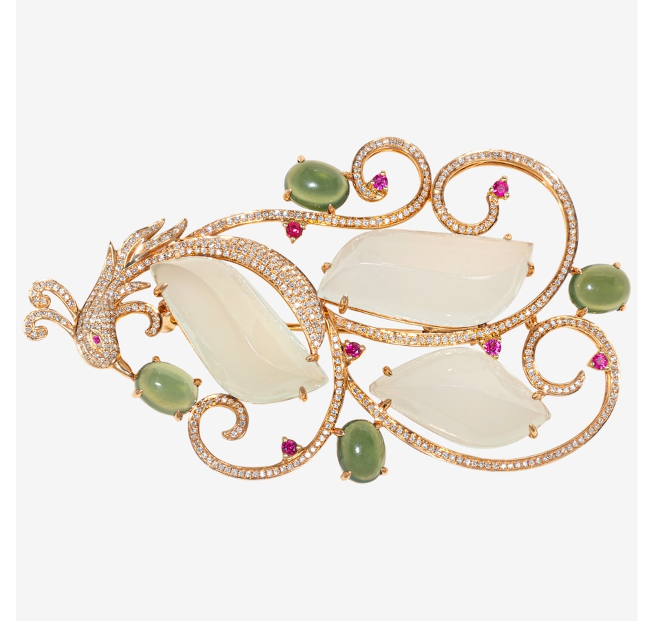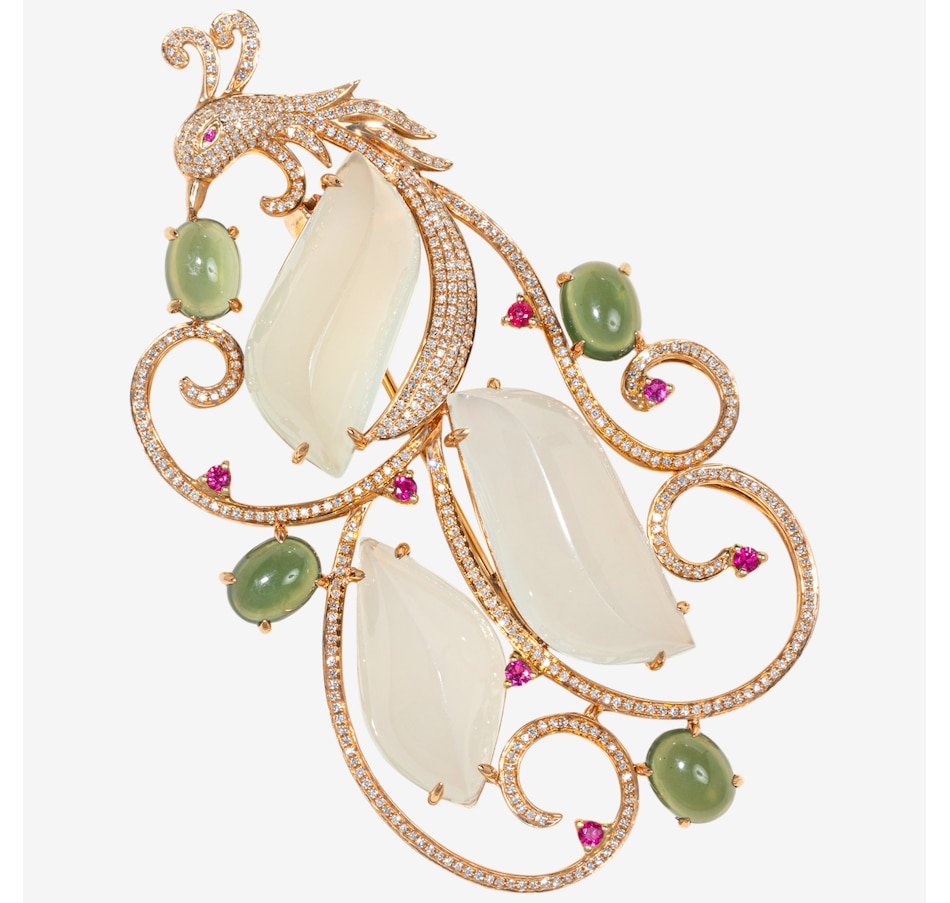 18K Rose Gold Chrysoprase, Ruby and Diamond Phoenix Brooch/Pendant