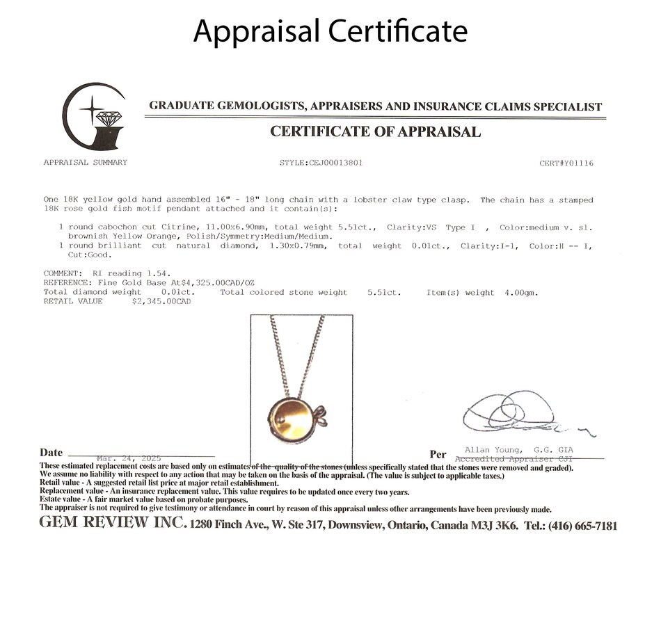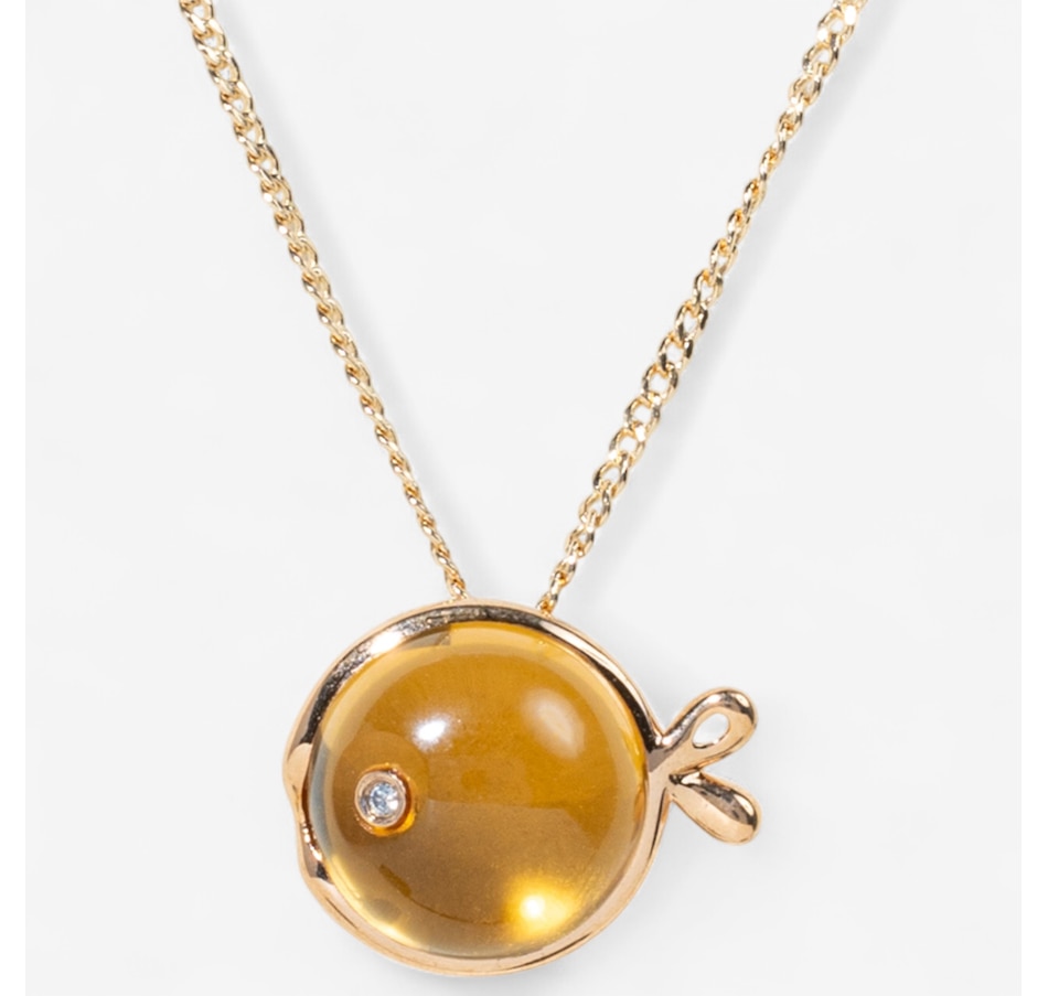 Whimsical yet refined, this enchanting fish motif pendant is crafted in luxurious beautiful rose gold and showcases a warm, golden-hued citrine as the body. The citrine is bezel set, its rich brilliance beautifully enhanced by a bezel-set diamond eye that adds a subtle sparkle and playful character to the piece. The fish is depicted in profile, complete with a delicate rose gold tail fin set to one side, creating a sleek and stylized silhouette.