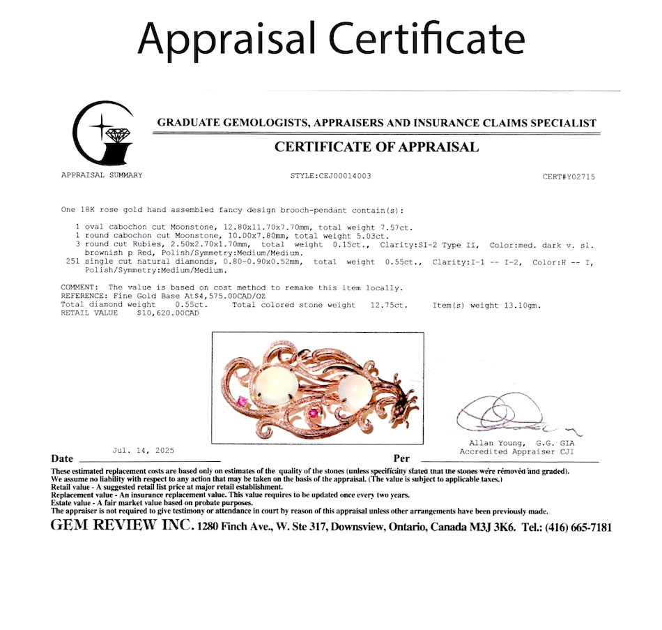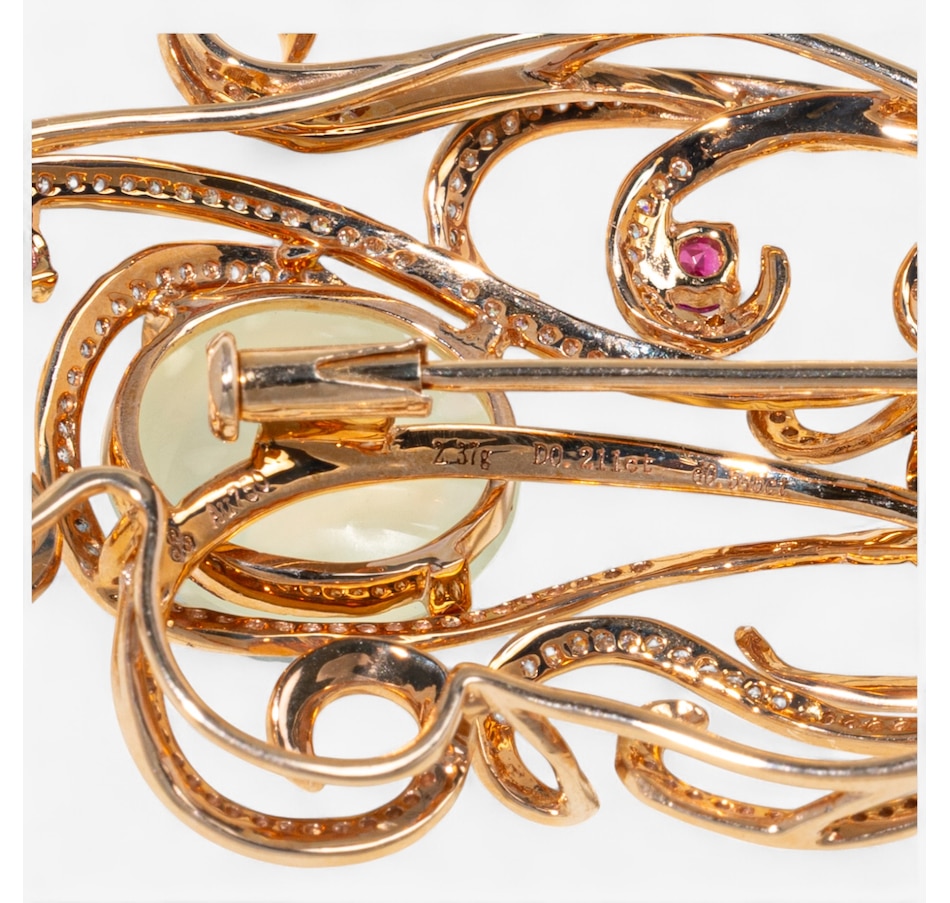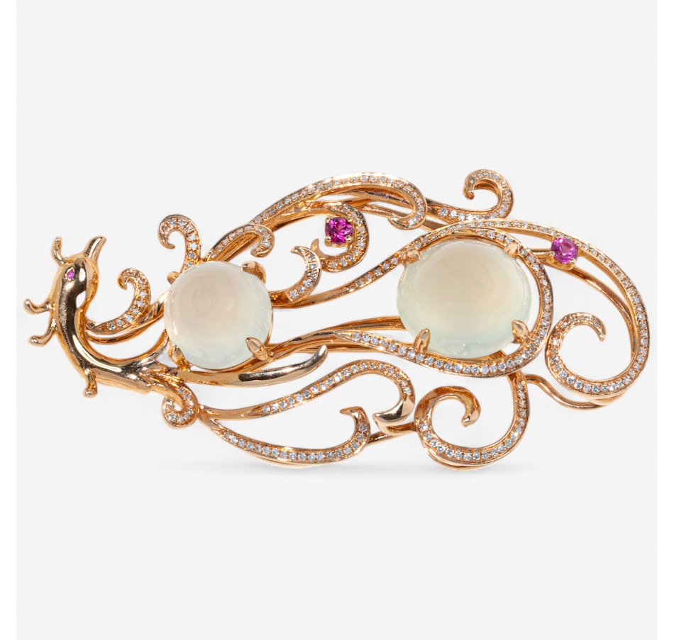 From this polished form, the piece unfurls into an opulent cascade of 251 prong-set diamonds, artfully arranged in sweeping, swirling patterns that mimic the natural flow of a peacock’s fanned plumage. Nestled between the diamond-lined swirls are two additional rubies, their rich red tones adding warmth and contrast to the radiant white brilliance of the diamonds. At the heart of the composition, two cabochon-cut moonstones are vertically set—one larger, round-shaped moonstone near the top, and a larger oval moonstone below—lending a soft, ethereal glow to the overall design.