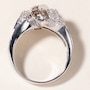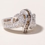 The central motif, a reverse 'S' shaped swirl, is channel-set with eight fancy champagne-coloured diamonds, set on the diagonal and shouldered by three diamonds on each end. Sweeping up from the shoulders and curling to nestle against the central diagonal are milgrain-trimmed ribbons of nineteen prong-set round, brilliant-cut diamonds and six channel-set champagne-coloured diamonds, split four and two, per side.
