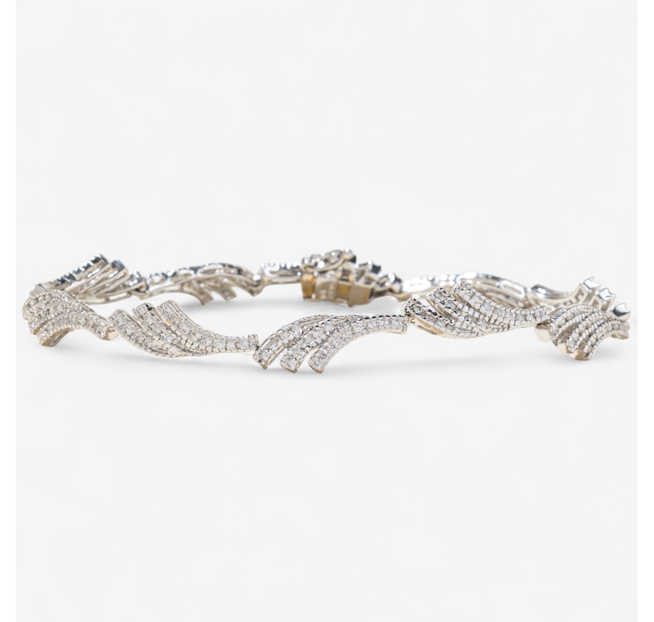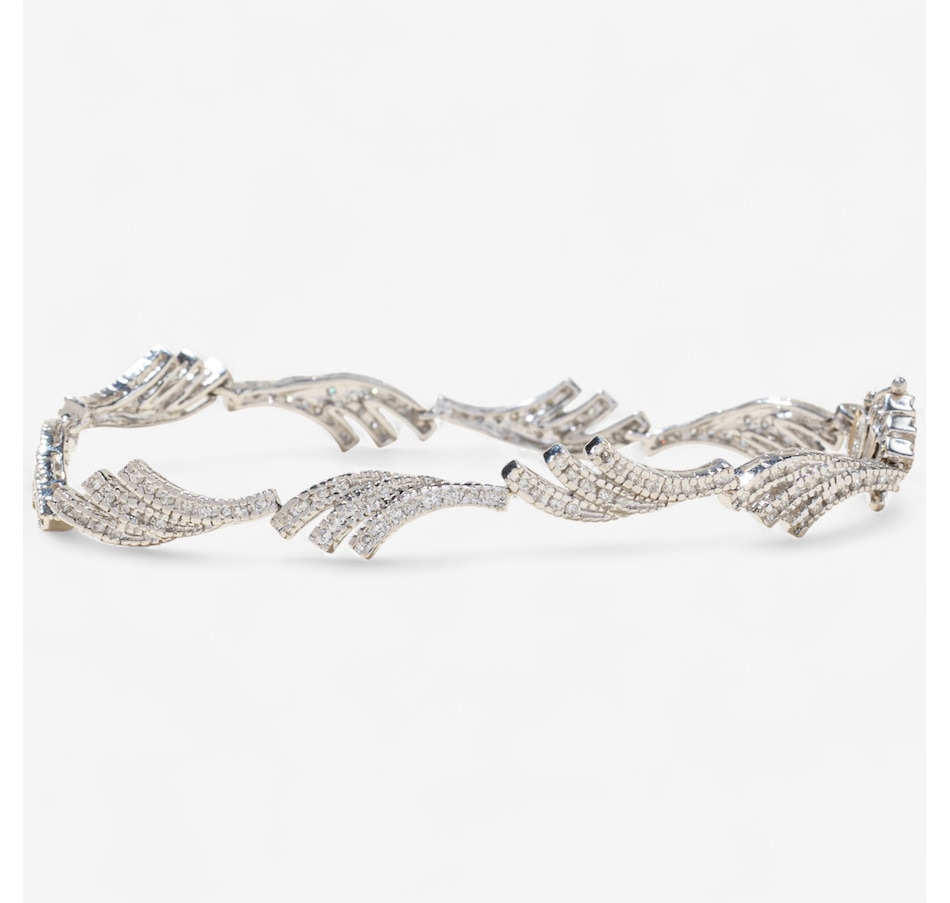 This breathtaking white gold wave design bracelet is a masterpiece of fluid motion and radiant elegance. Each link is meticulously crafted with three curved bars that fan out in a graceful wave, evoking the delicate rhythm of the ocean’s ebb and flow. The links are arranged in an alternating pattern, with every other link facing up or down, creating a dynamic and harmonious movement along the wrist.