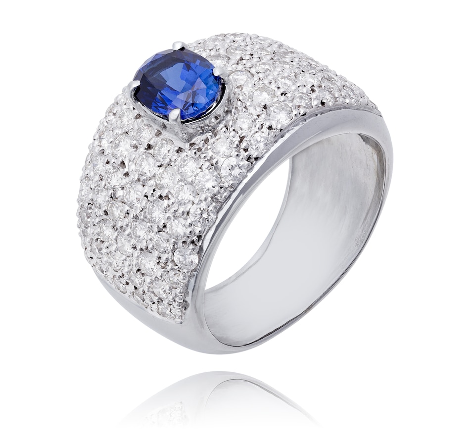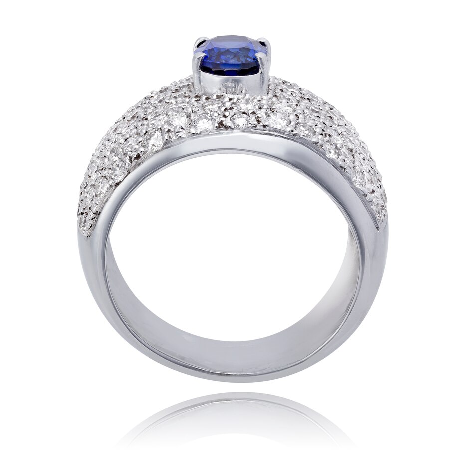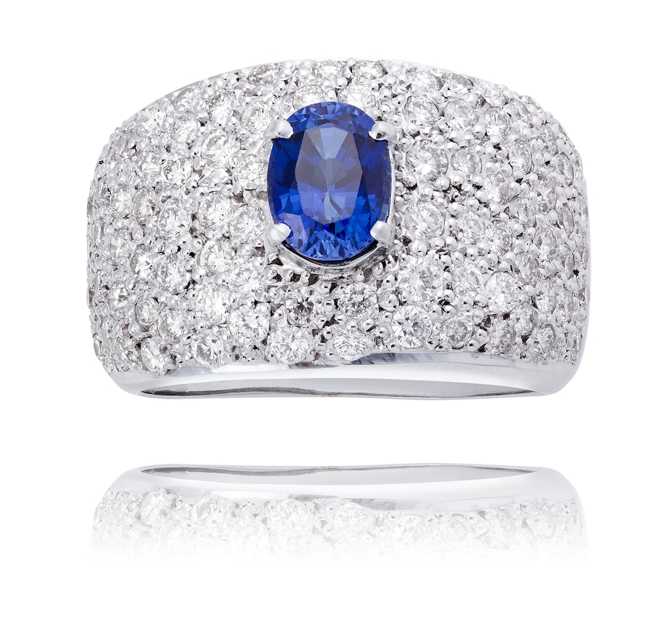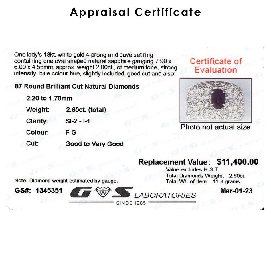 • Specs: (1) oval shaped blue sapphire (2.00 av. ctw), (87) round brilliant cut diamonds (2.60 av. ctw)