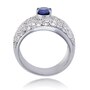 This fabulous 18K white gold grand dame ring is centered with a prong-set 2.00 carat intense blue sapphire. Eighty-seven pave set round brilliant cut diamonds run finger to finger, knuckle to knuckle presenting a dazzling display of brilliance and combining for a 2.60 total carat weight. Adding to the brilliance is the exceptional F-G colour of the diamonds.