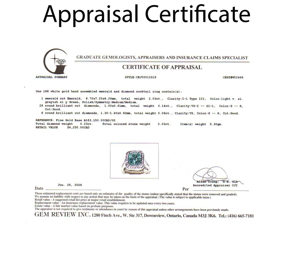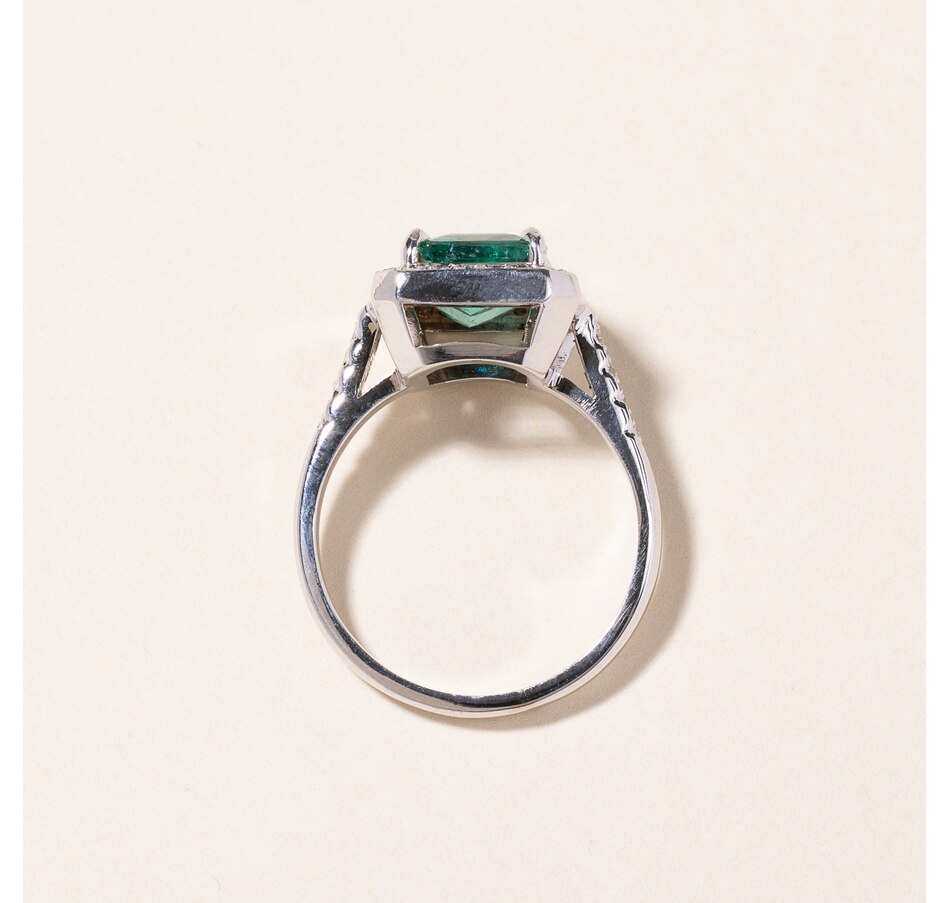 A bold and beautiful 2.03-carat emerald-cut emerald, with a vibrant, bright crystalline green colour, radiates from within a 14K white gold four-prong setting. Following the contours provided by the emerald, 28 dazzling white round, brilliant-cut diamonds frame surrounds the emerald in a halo style, together weighing 0.14 carats. This arresting assemblage of colour and sparkle is supported by diamond-set shoulders, each shining with four round, brilliant-cut diamonds, that lead to an elegant high-polished shank; these eight diamonds combine for an additional 0.09 carats. A blocky bold undergallery adds the finishing flourish to this classic, timeless treasure.
