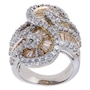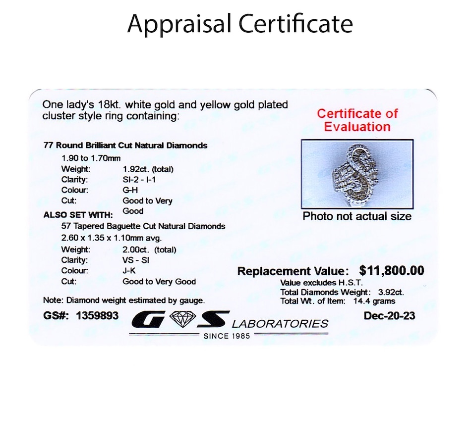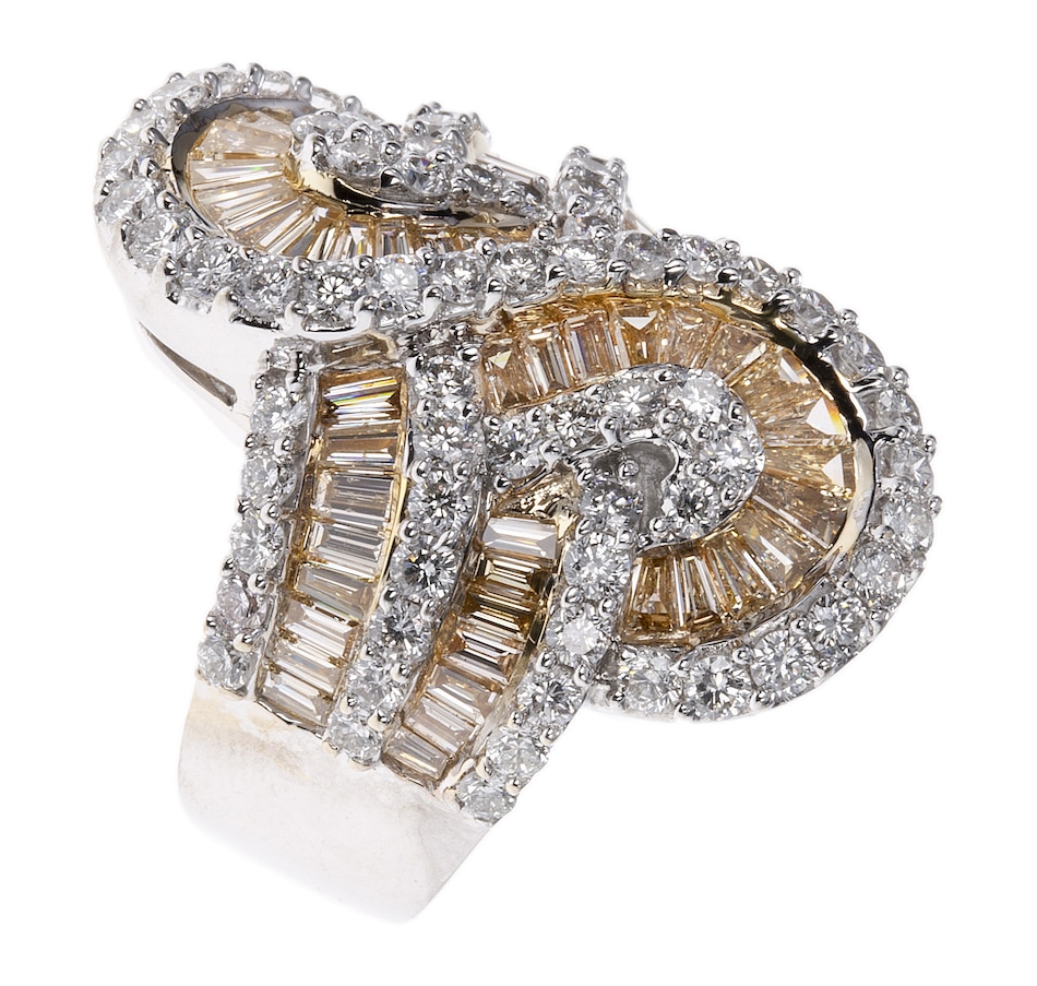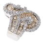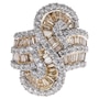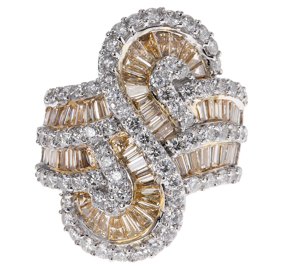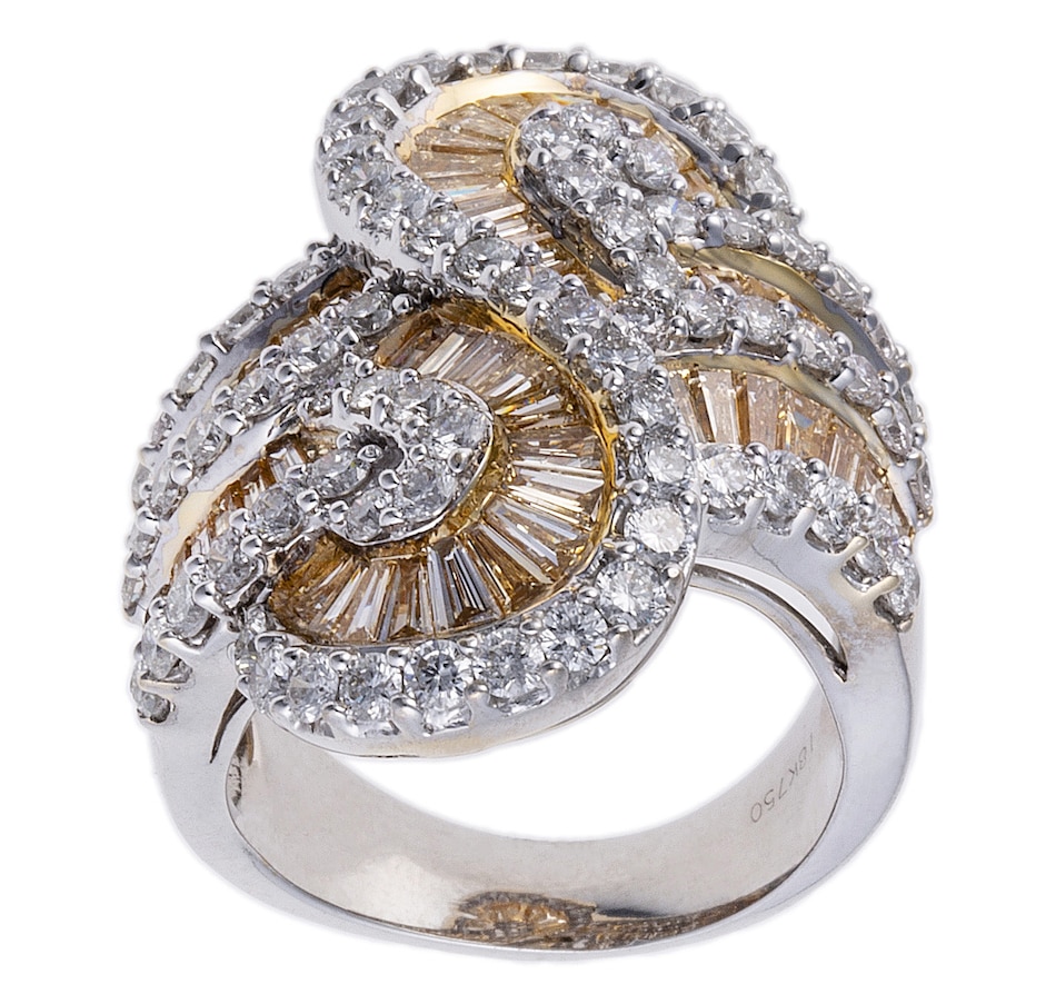 This fancy diamond ring is crafted in 18K white gold and features an "S"-shaped swirl that spans from knuckle to knuckle. The swirl is outlined with 29 round, brilliant-cut diamonds forming the "S," and the interior is filled with 14 tapered baguette-cut diamonds, top and bottom. Six additional round, brilliant-cut diamonds identify both sides of the "S" shape and separate it from the double row, round and baguette-cut, band. The trim on each side of the band has five, seven and six, round brilliant-cut diamonds, respectively per side with eight and seven baguette-cut diamonds sandwiched in between. Making it even more interesting is the two-tone appearance as the baguettes are yellow gold plated on top of the white gold. The 134 diamonds combine for a 3.92 total carat weight, spanning knuckle to knuckle and finger to finger.