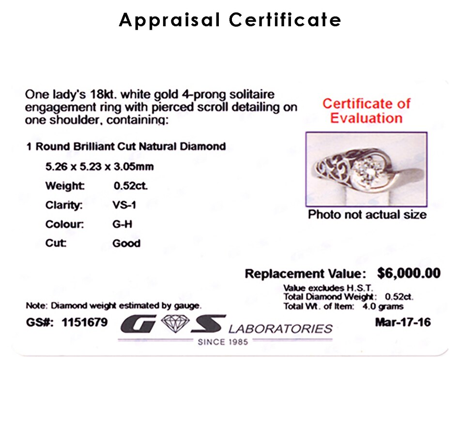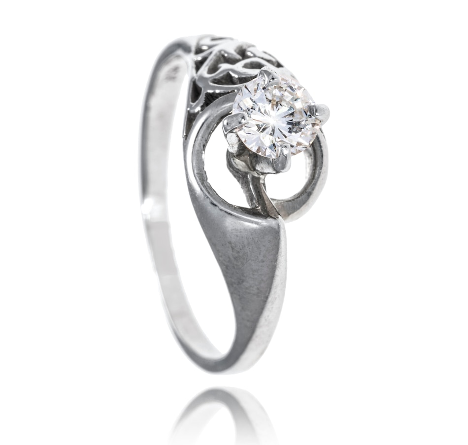 • Estate Originals 18K White Gold 4-Prong .52 Carat Diamond Solitaire Ring with Scrolled Detail on One Side