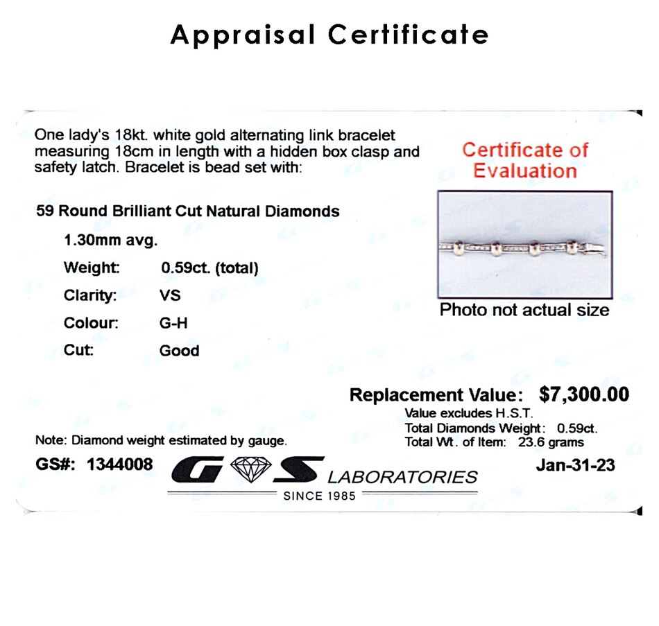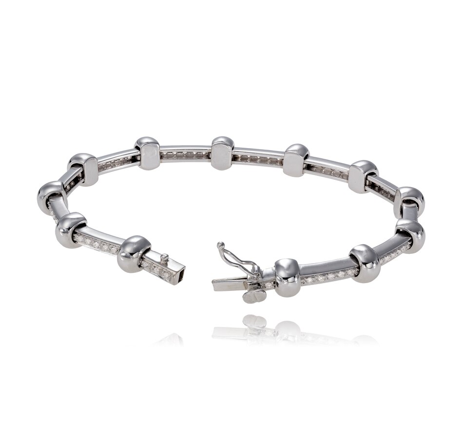 This 18K white gold piece is designed as a line bracelet and features bar links, each set with five round brilliant cut diamonds, that alternate with a high polished white gold bead, from clasp to clasp. The fifty-nine diamonds combine to offer a 0.59 carat total weight, and all display VS clarity and G-H colour. It measures 7" in length and secures with a hidden box clasp with safety latch.