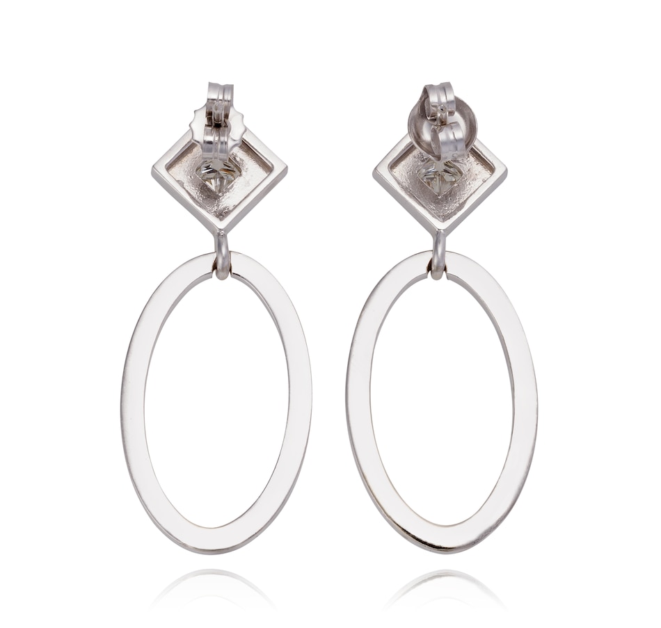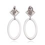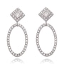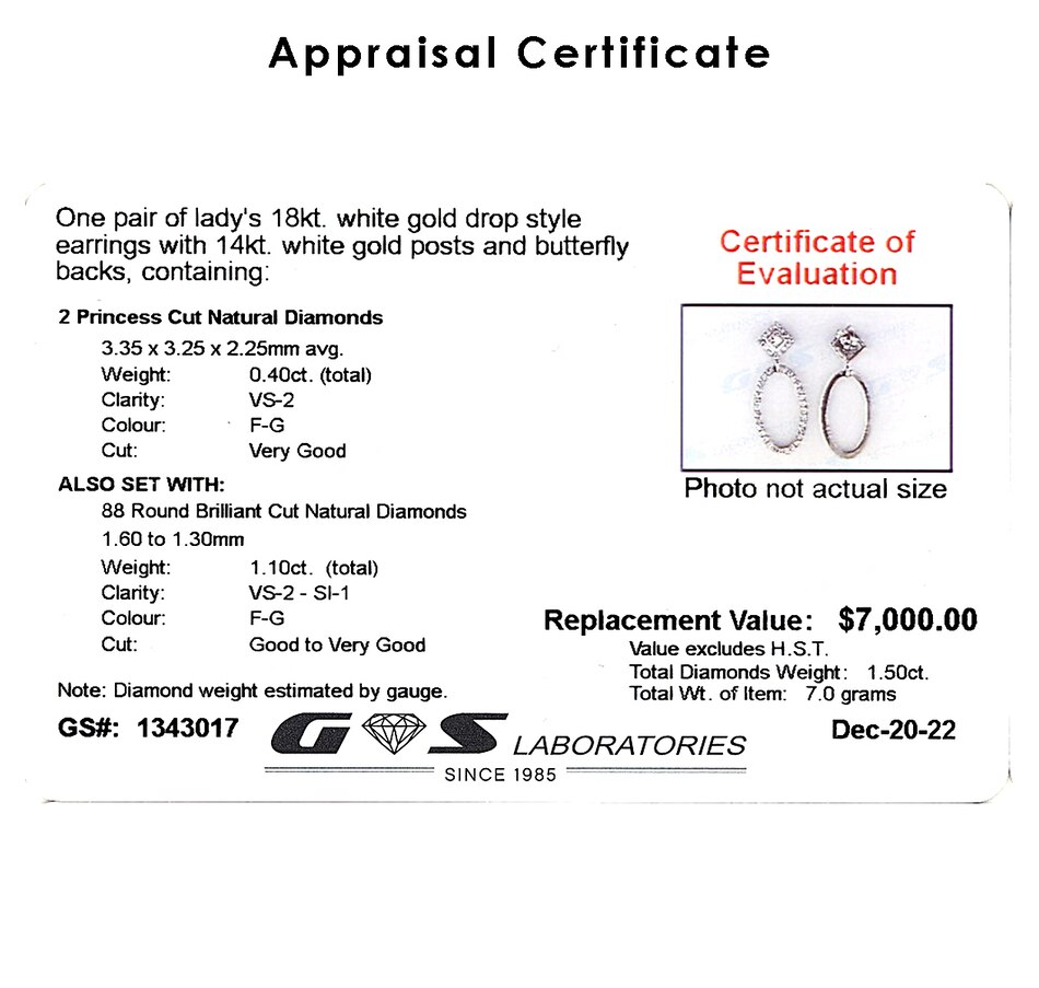 These decadent drop style earrings are crafted in 18K white gold and each feature a bezel-set 0.20 carat princess cut diamond, surrounded by a row of fourteen round brilliant cut diamonds turned sideways to appear diamond in shape. The halo is attached to an open oval shaped link, prong-set with thirty round brilliant cut diamonds. The eighty-eight round brilliant cut diamonds combine for 1.10 carats, and the two princess cut diamonds contribute 0.40 carats ( .20 carats each.) The total diamond weight for these impressive earrings is 1.50 carats. The matching necklace ir product number 737318.