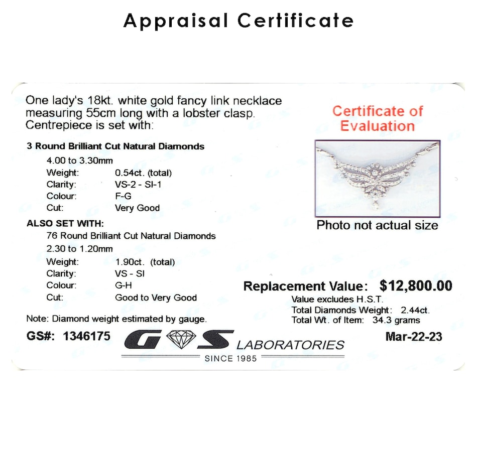 This dramatic necklace features an elegant butterfly shaped centerpiece loaded with diamonds. The wing-like span exhibits three rows with negative space between and is prong-set with diamonds. At the tips of the lower rungs are two larger prong-set diamonds. A series of marquise shaped plates create a spray at the bottom and are each separated by prong set diamonds. A larger diamond drops with a pendulum swing from the bottom. At the top, nestled in the centre is another larger diamond that is crowned with four additional prong-set diamonds. Combined, there are seventy-six of the smaller diamonds and three of the larger providing a 2.44 total carat weight. The bold chain is made up of elongated fluted links, each attached via a circular opening at the top. The chain measures 19" in length and secures with a lobster claw clasp.
