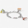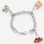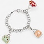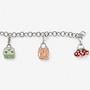This playful white gold charm bracelet from the renowned Italian brand Rosato is unique with its open square links and lobster clasp adorned with pink enamel. The bracelet features three extraordinary purse charms, each beautifully crafted, using electroform technology, to reflect the brand's artistic flair and attention to detail. The first charm is an 18kt white gold purse, delicately adorned with light green enamel, red hearts, and yellow sides, evoking a charming and lively whimsical vibe. The second charm showcases an orangey-pink handbag with intricate butterfly designs, paired and white panels on the sides, exuding a sense of feminine grace and vibrant energy. The third charm features a bold red purse with gold-coloured splotches, adding a touch of glamour and modern sophistication to the ensemble.