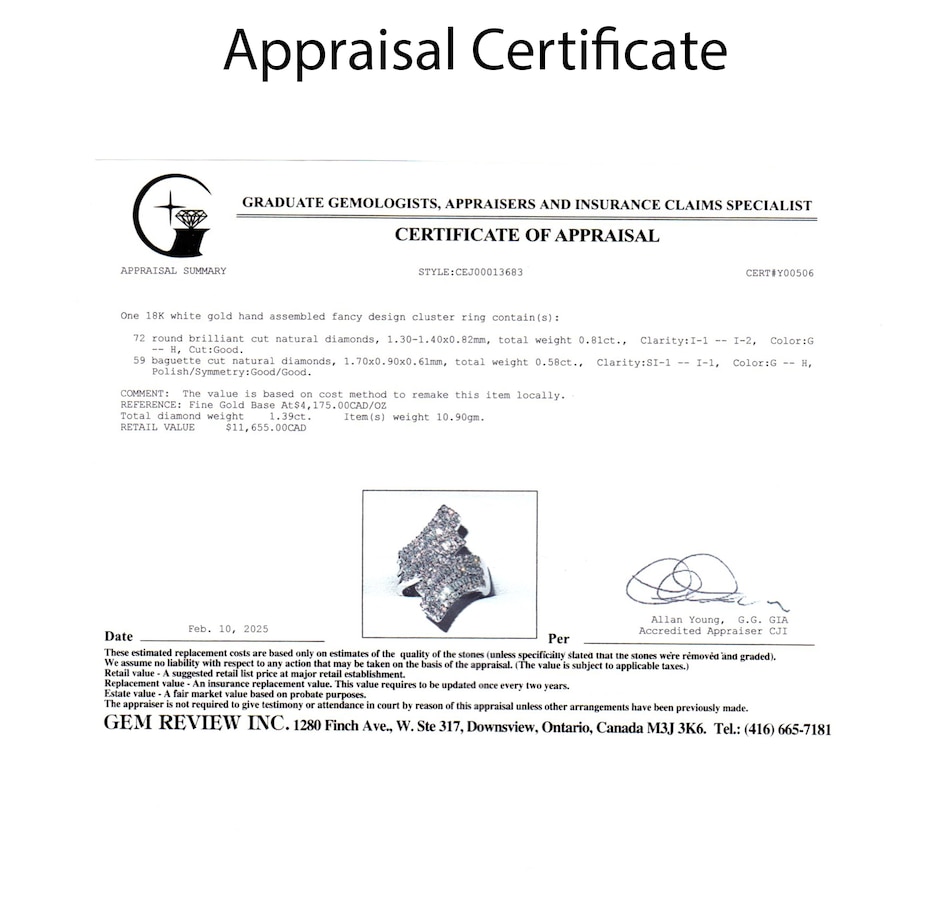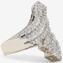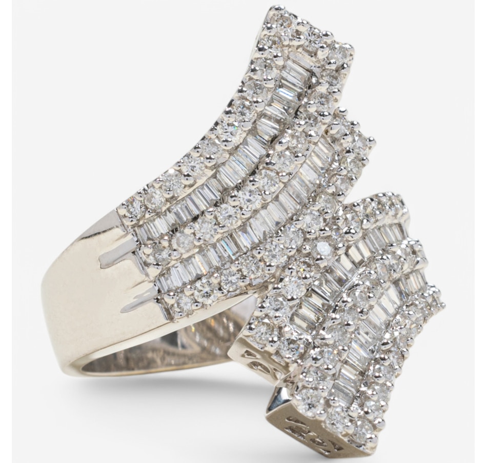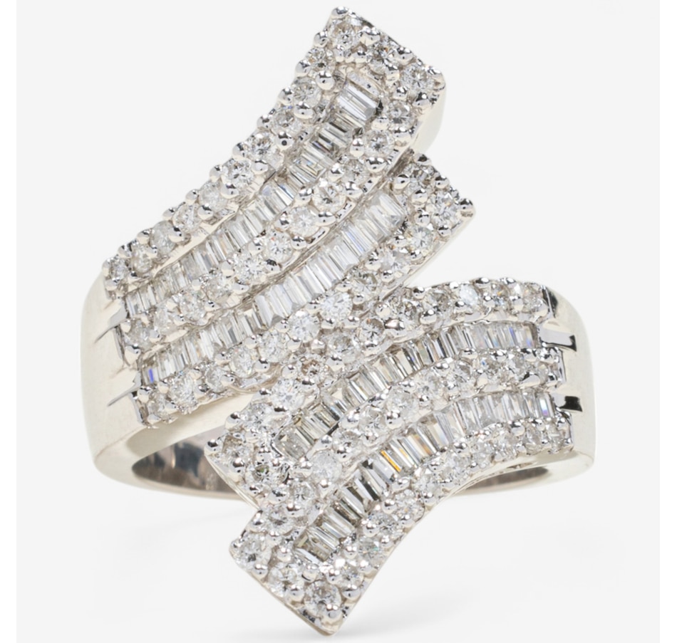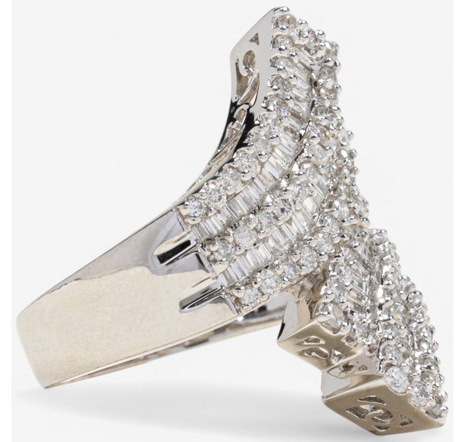 This stunning 18K white gold bypass ring artfully showcases a sophisticated and modern design, featuring two curved rows of sparkling baguette-cut diamonds on each side, fifty-nine in total. The sleek, twisting bypass style, curling north and south, is enhanced by the brilliant contrast of seventy-two round brilliant-cut diamonds that frame the four rows of baguettes, adding an extra layer of elegance and sparkle. The design creates a graceful flow that is enhanced by the pierced scroll undergallery. Exuding a refined beauty and contemporary allure, the one hundred and thirty-one diamonds combine for an impressive 1.39 carats.