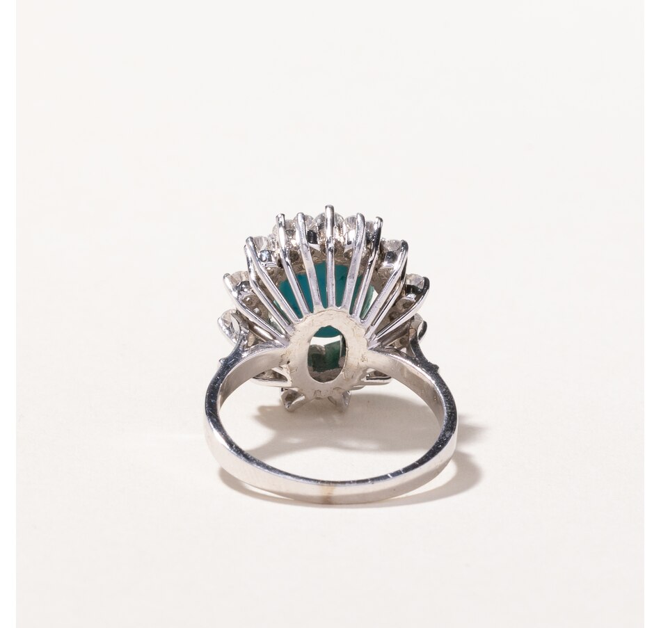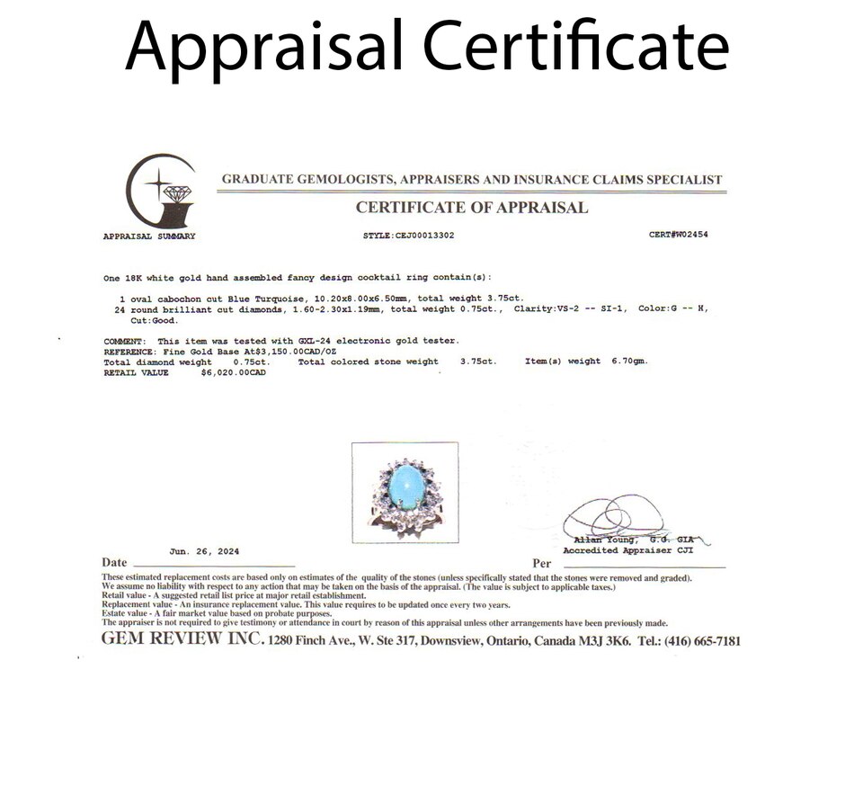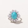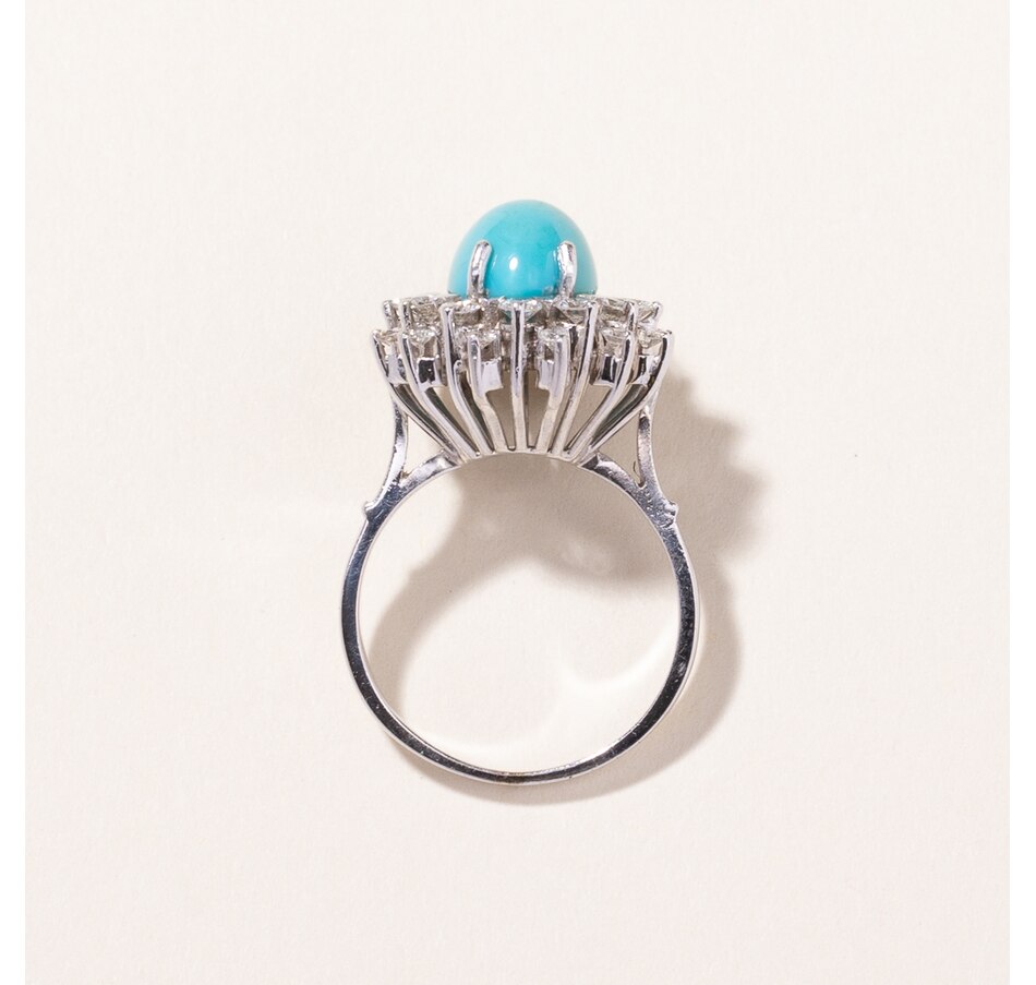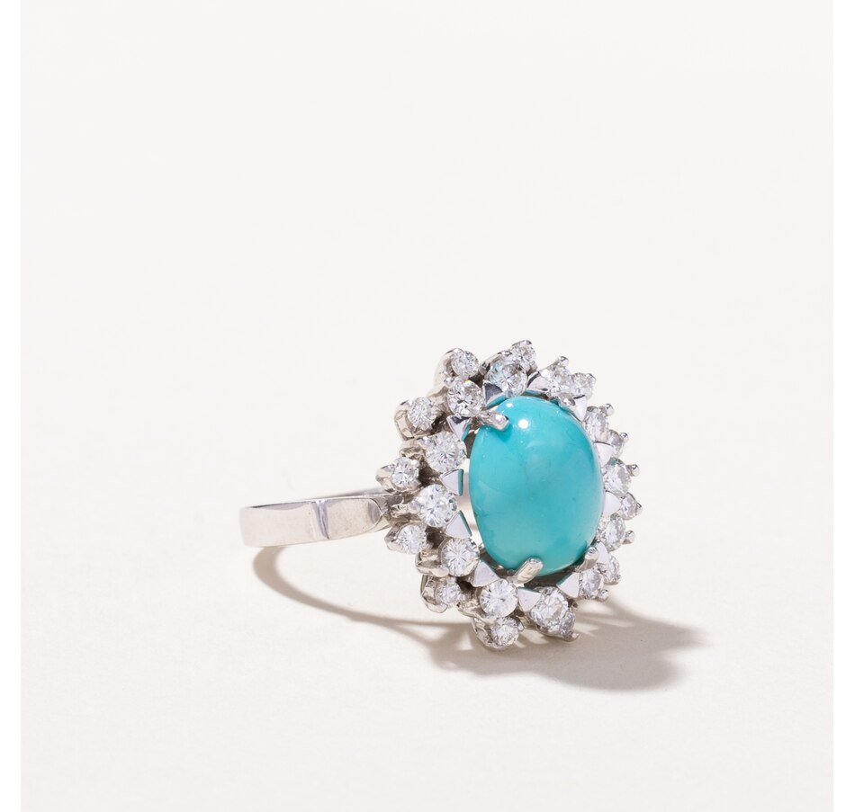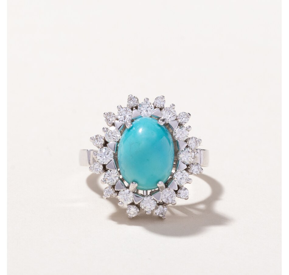 • (1) oval shaped turquoise (3.75 .ctw), (24) round brilliant cut diamonds (0.75 .ctw)