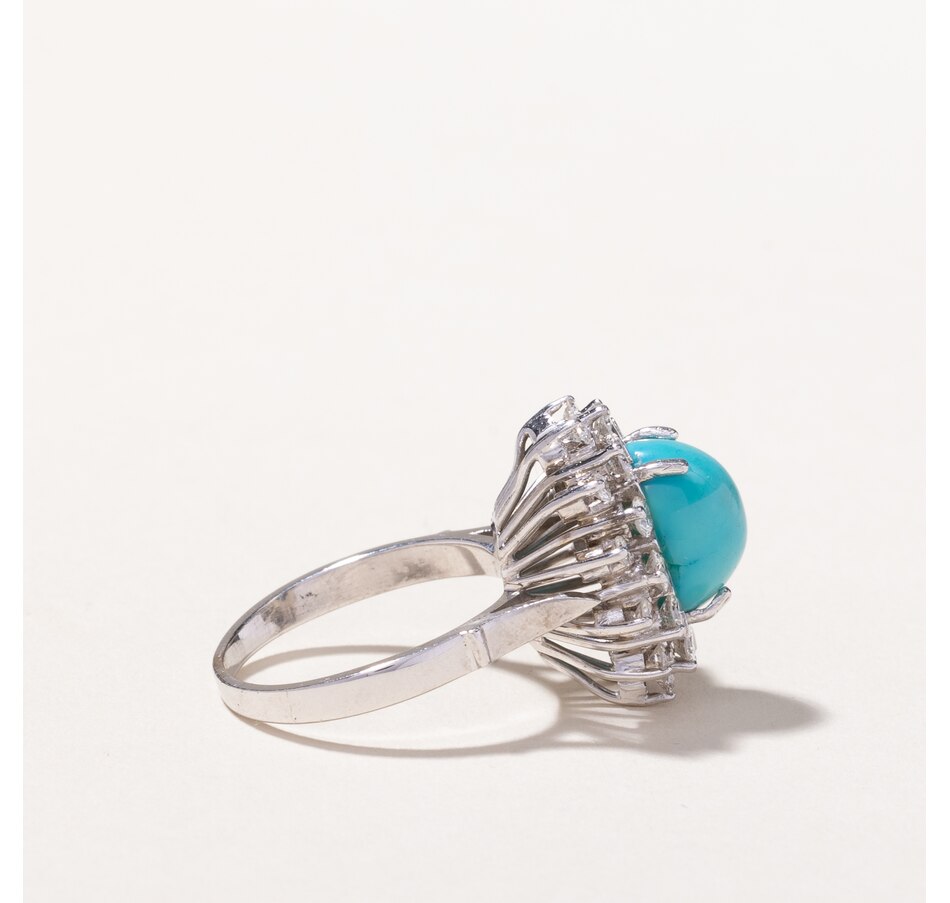 A vibrant 3.75 carat high-cabochon cut robin's egg turquoise flaunts its cheery hue in a multi-layer double surround of twenty-four bright-white and sparkling diamonds (total weight 0.75 carats) in this gorgeous vintage jewel. It's like a little piece of the sky-surrounded by twinkling stars. The mesmerizing arrangement crowns an understated 18K white gold mounting with open spindles and ski tip band.