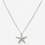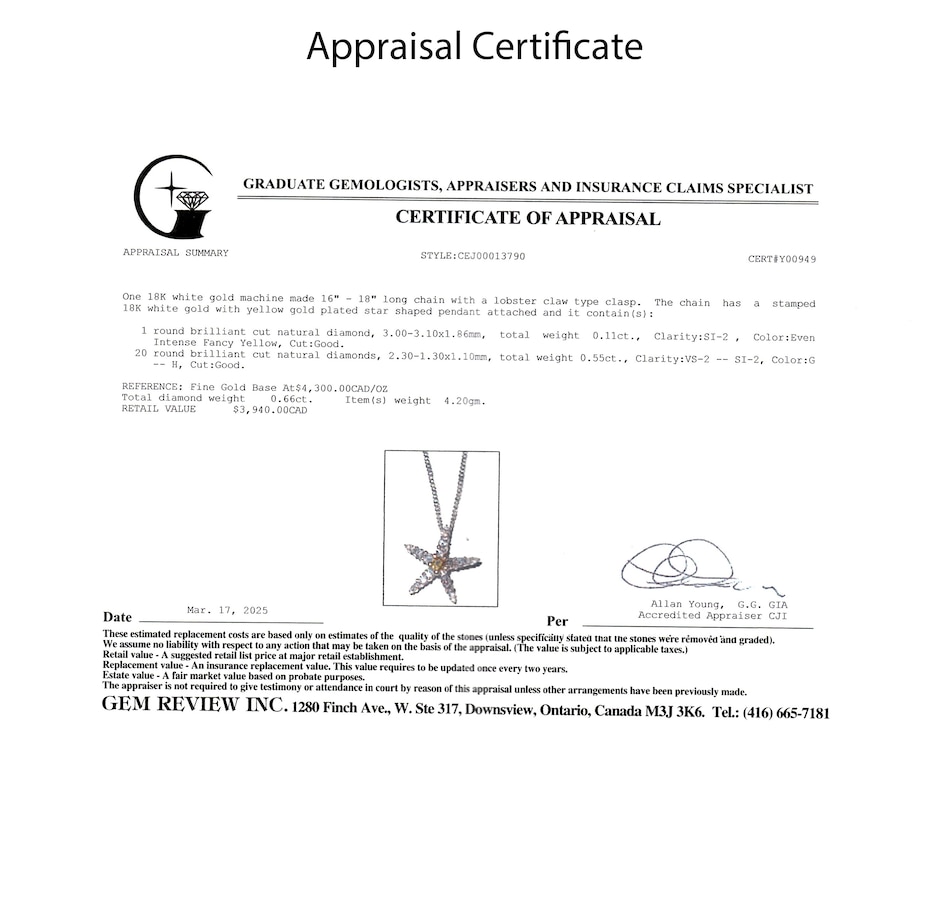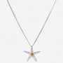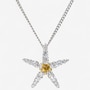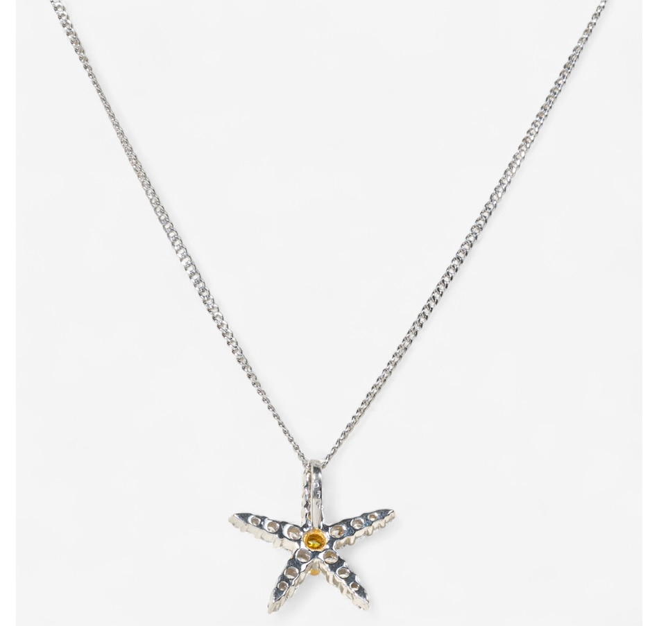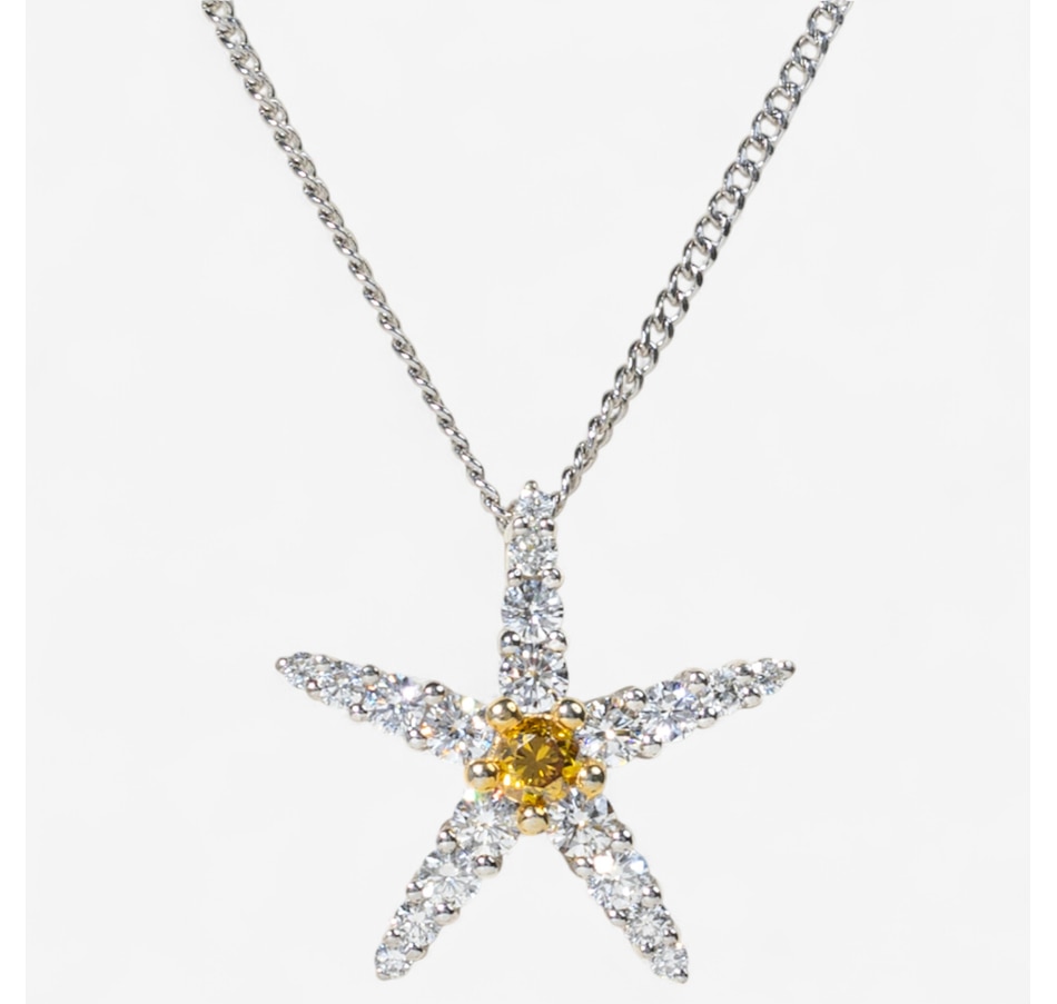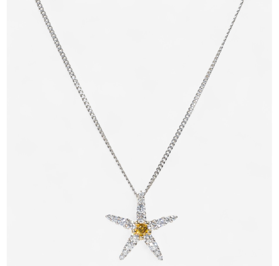 This enchanting white gold pendant is designed to resemble a graceful starfish, symbolizing the beauty of the ocean. Its five rays are elegantly adorned with twenty pave-set diamonds, each one sparkling with brilliance as they extend outward, creating a dazzling effect. At the centre of the pendant, a striking natural yellow diamond adds a vibrant pop of colour, offering a stunning contrast to the shimmering white diamonds. A hidden bale is located at the back and a white gold adjustable curb link chain with lobster clasp is included,.