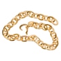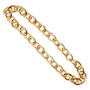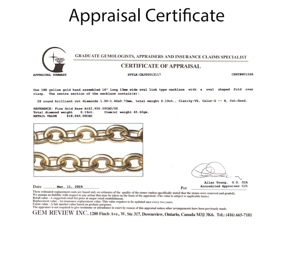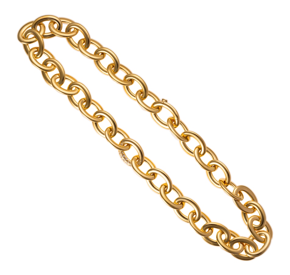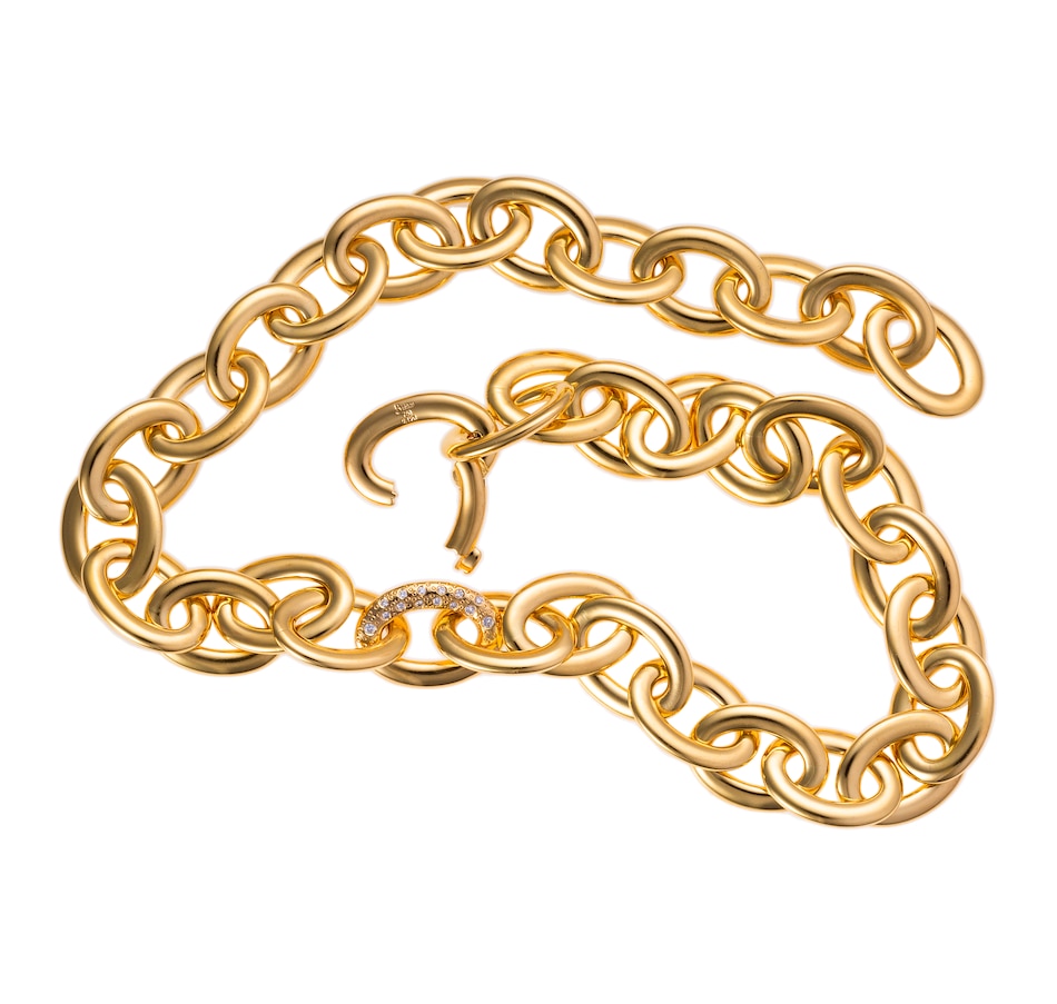 This substantial 16” necklace is crafted in 18K yellow gold and features interlocking 13mm wide, high polished oval links. The middle link is set on one half, with a double row of fourteen round brilliant cut diamonds. The opposite side is additionally set in the same pattern with fourteen diamonds allowing the necklace to flip without losing the sparkle provided by the stones. The twenty-eight diamonds combine for 0.19 carats. Affixed to the back is an oval clasp, identical to the links, that lifts to open to provide a very secure closure.