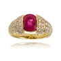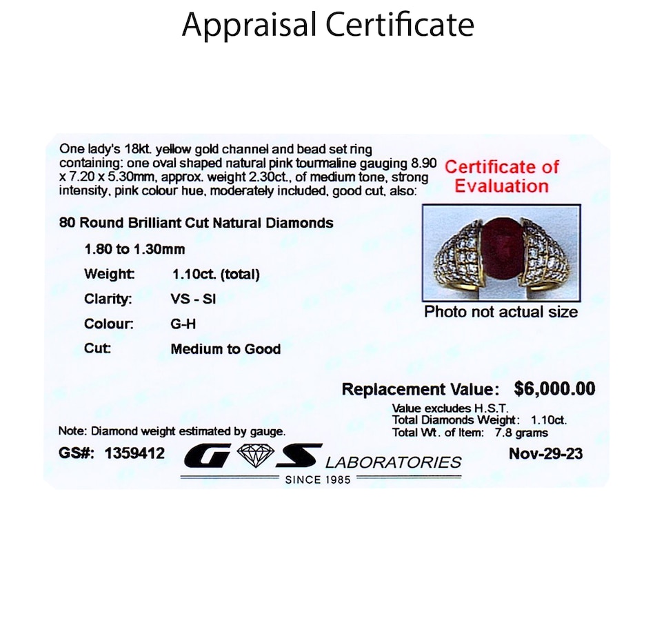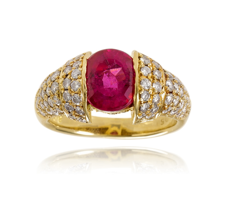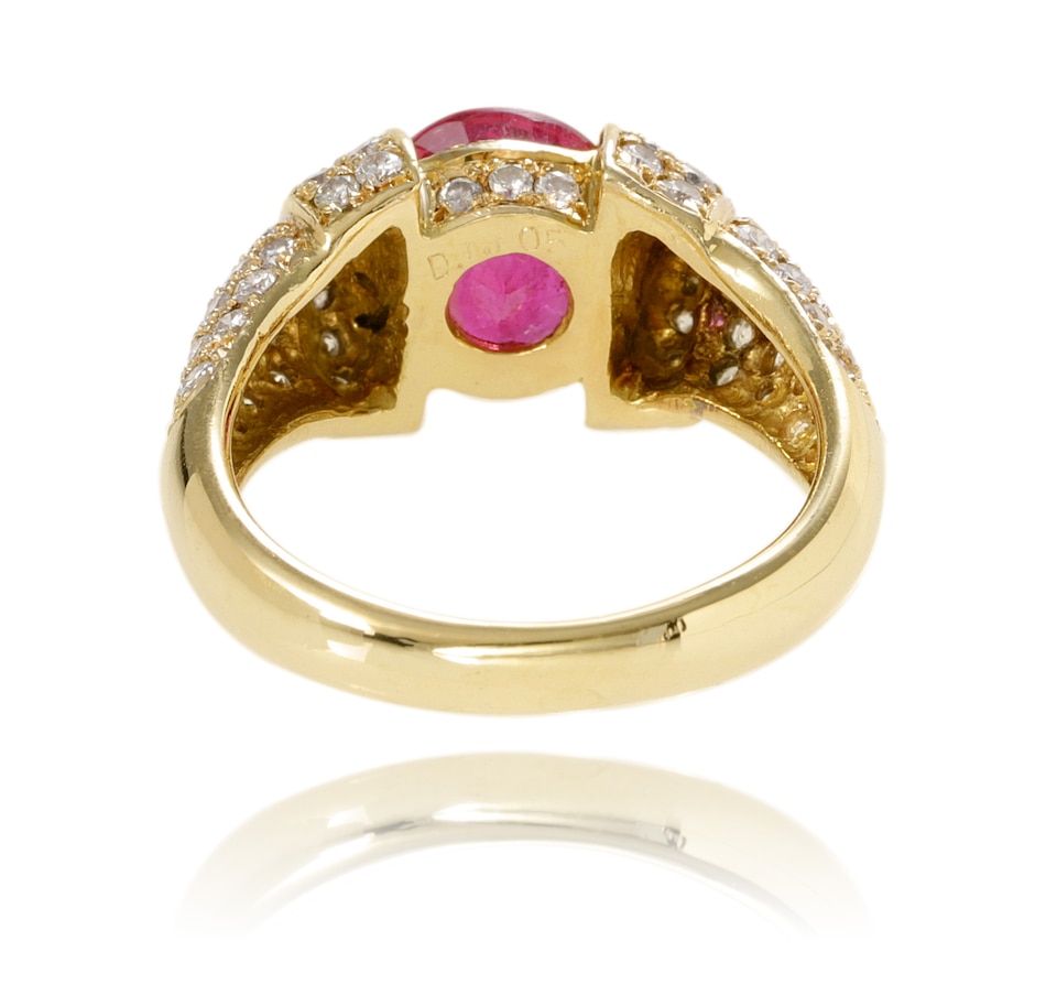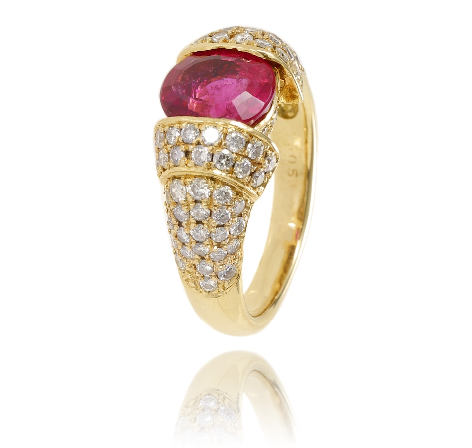 This dazzling ring is crafted in 18K yellow gold and features a 2.30-carat oval pink tourmaline channel-set at its centre. Domed shoulders, each containing two vertical rows of round, brilliant-cut diamonds (eight on the first row and seven on the second) caress the tourmaline. The band is further sectioned of with a tapered oval containing an additional 22 bead-set round, brilliant-cut diamonds per side. Finally, three more diamonds trim the undergallery providing a boost of brilliance to the already vibrant pink tourmaline. The 80 round, brilliant-cut diamonds combine for 1.10 carats.
