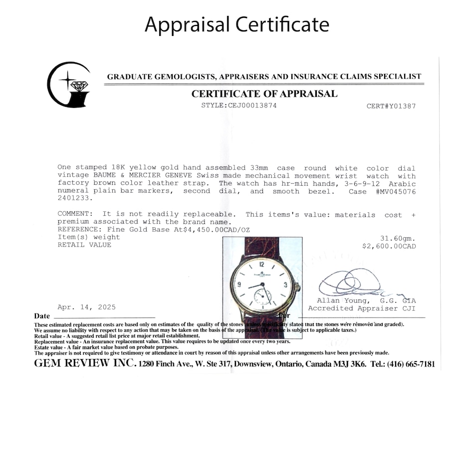 This beautiful gold vintage BAUME & MERCIER Geneve watch features a 33 mm case diameter with a round white coloured dial and ribbed high polished bezel. It features beautiful crisp lines, a clean finish and signed crown and clasp. It is powered by a Swiss made mechanical movement and is attached to a factory brown colour leather strap. It has gold coloured Arabic numerals at the 3, 9 and 12 o'clock and baton markers indicating the remaining hours. The hands are gold coloured hour and there is a seconds sub-dial at the 6 o'clock. The case number is #MV045076 2401233.