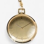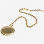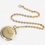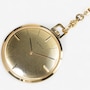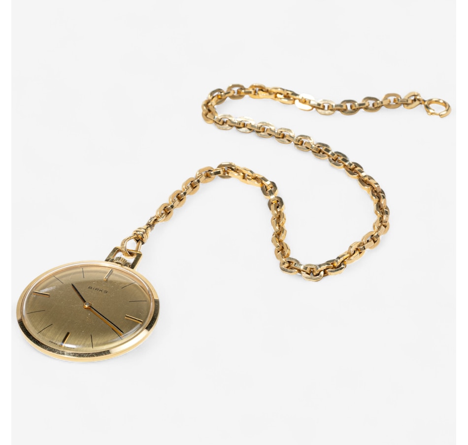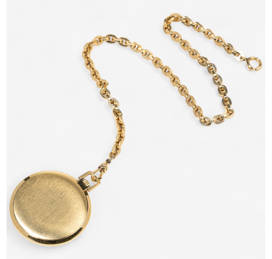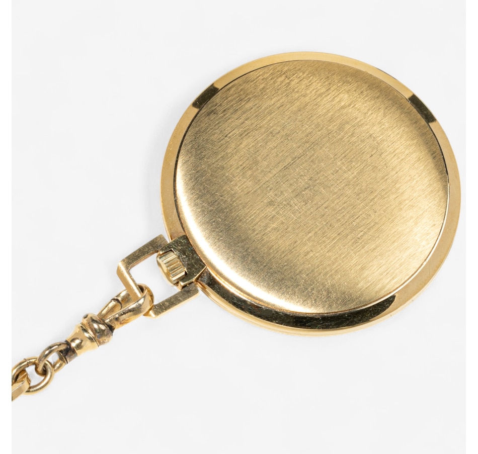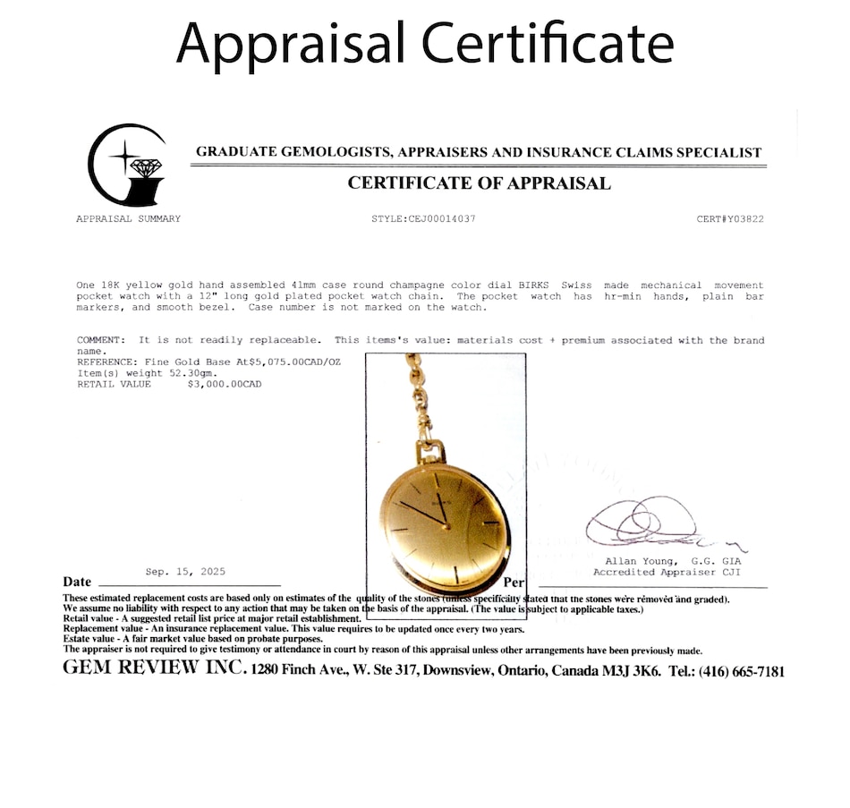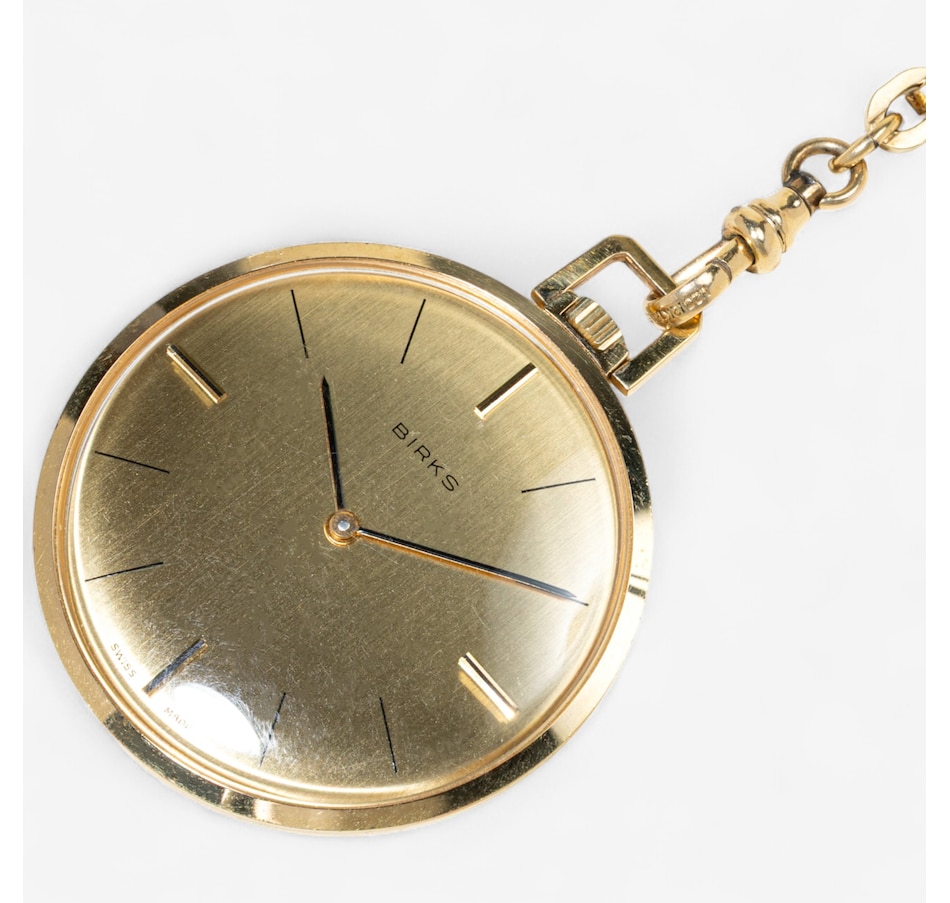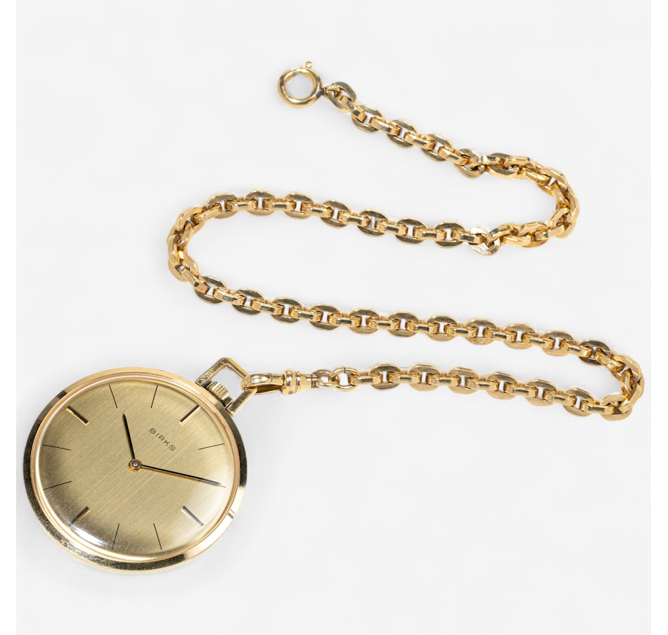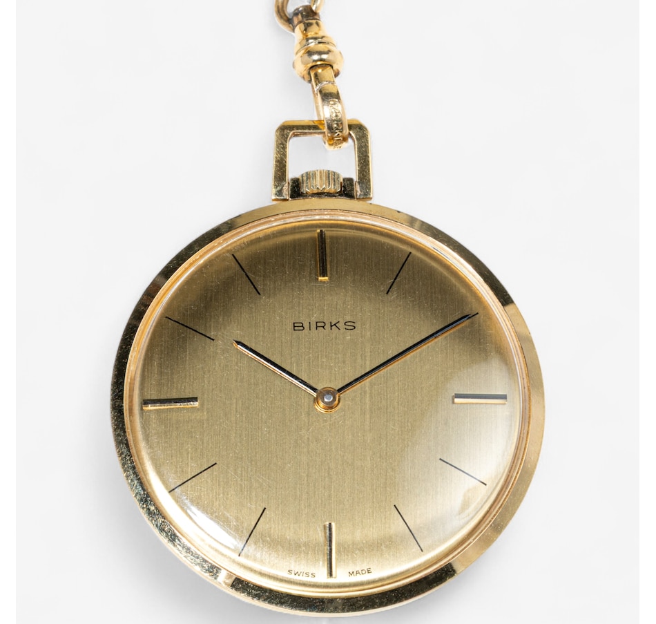 This distinguished Birks pocket watch is a tastefully designed luxury timepiece. The case is crafted in 18K yellow gold, which gives it a warm, lustrous tone that ages beautifully over time. The back is brushed finish, softening reflections and offering a subtle contrast to the polished bezel and case body. The watch is open‑face style (meaning no cover over the dial), emphasizing simplicity and ease of reading. With a diameter of 41 mm, this is a relatively large pocket watch, substantial in hand, yet still manageable. The dial is a champagne colour, giving it a subdued, classic appearance. It carries stick (baton) hour markers, which keep the design minimal and clean. The minute and hour hands are gold‑toned, matching the case and harmonizing with the dial tone. It is powered by a mechanical movement. Attached is a gold plated 12‑inch long chunky rolo link chain.