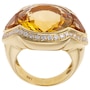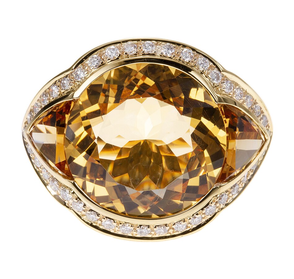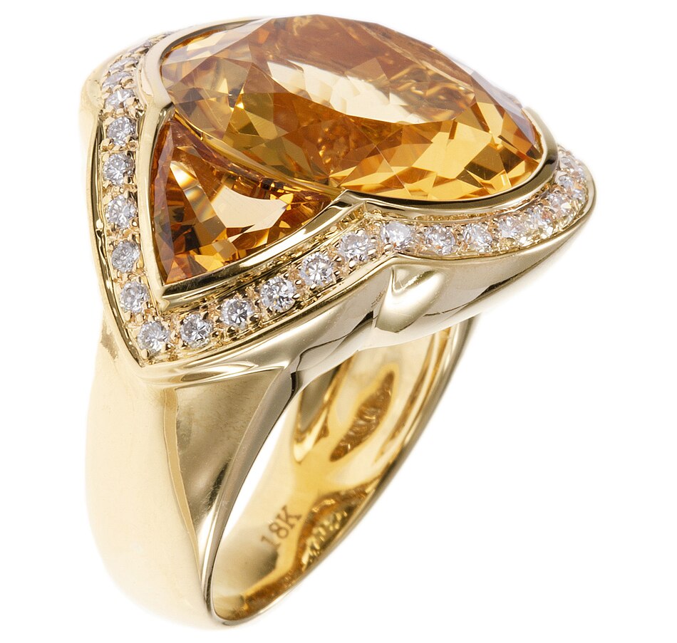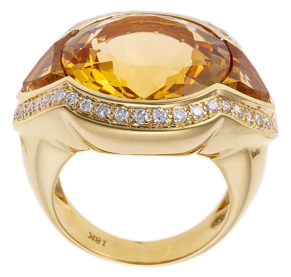 This designer's dream is crafted in 18K yellow gold and boasts a 10.26 carat round shaped citrine , semi-bezel set in the centre. Shouldering the round citrine is a 0.93 carat triangular cut citrine, angled on each side. The seamless flow between the round and triangular cut citrines is a result of the lack of prongs. The flat edge of the triangles butt up against the edge of the round, and a high polished bezel frames all three. A second bezel frames the forty round brilliant cut diamonds that are bead set around the outside. The high polished band is a masterpiece architecturally with its bold angles, soft curves and knife edge shank.