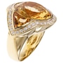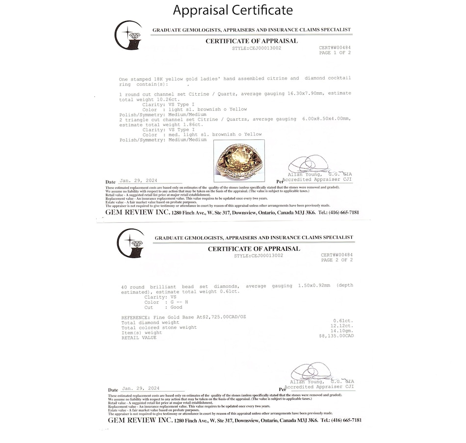 • Specifications: (1) round shaped citrine (10.26 av. ctw), (2) triangular cut citrine (1.86 av. ctw), (40) round brilliant cut diamonds (0.61 av. ctw)