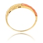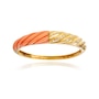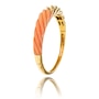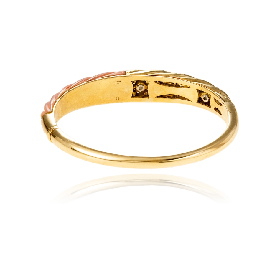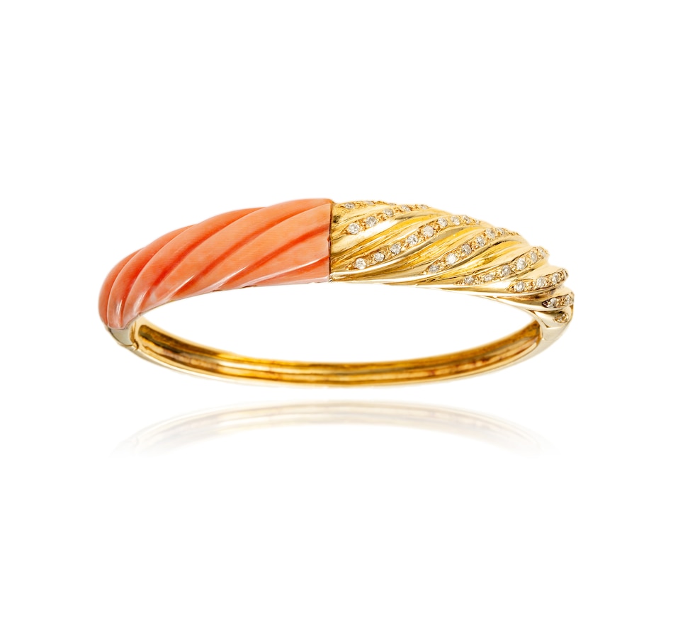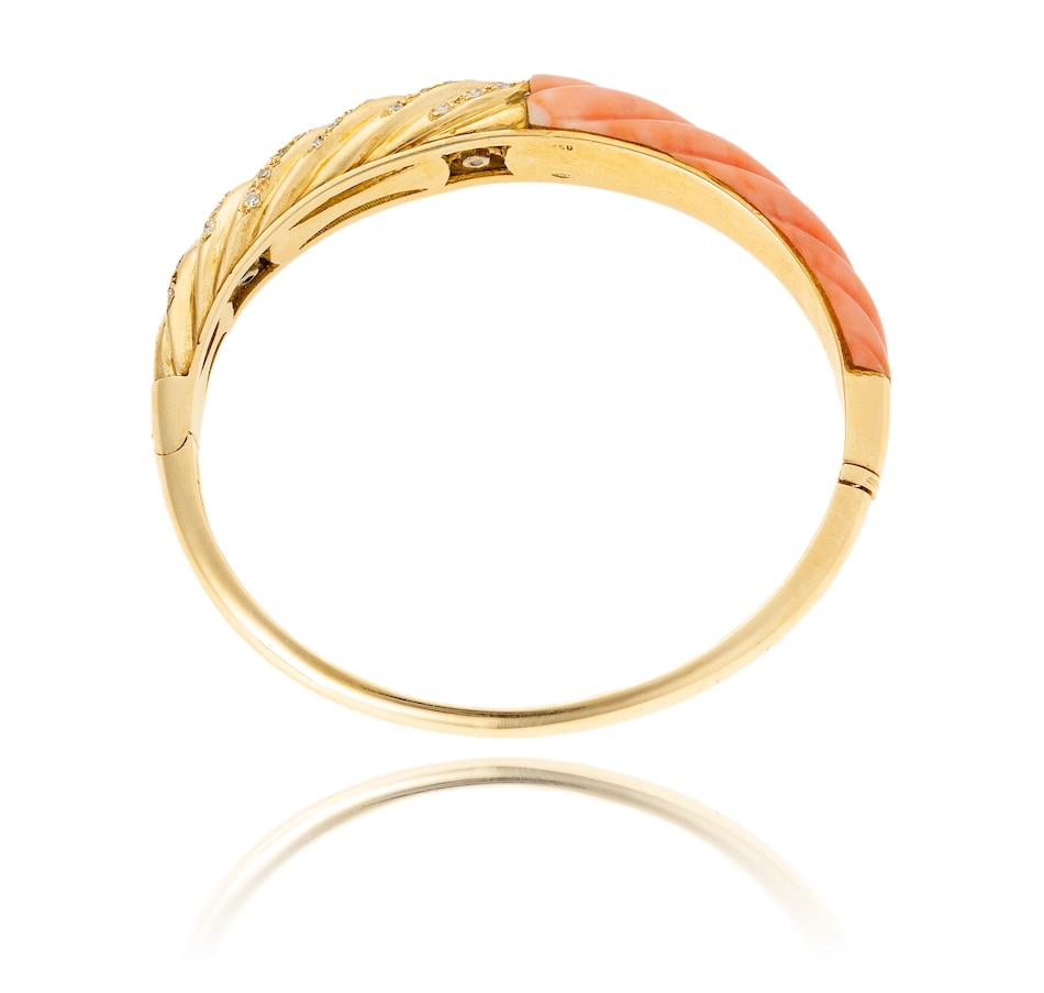 This fancy design bangle bracelet is crafted in 18K yellow gold and features a corrugated top with a custom cut pink colour angel skin coral on one side. The other half, also corrugated, features seven rows of diamonds, forty-one in total, with a diamond weight of 0.59 carats. For protection purposes, the underside of the bangle is finished with a heavy gold backing. The other side of the bangle is finished in high polished gold and a hidden box clasp is located on the side. The matching earrings are product number 743840.