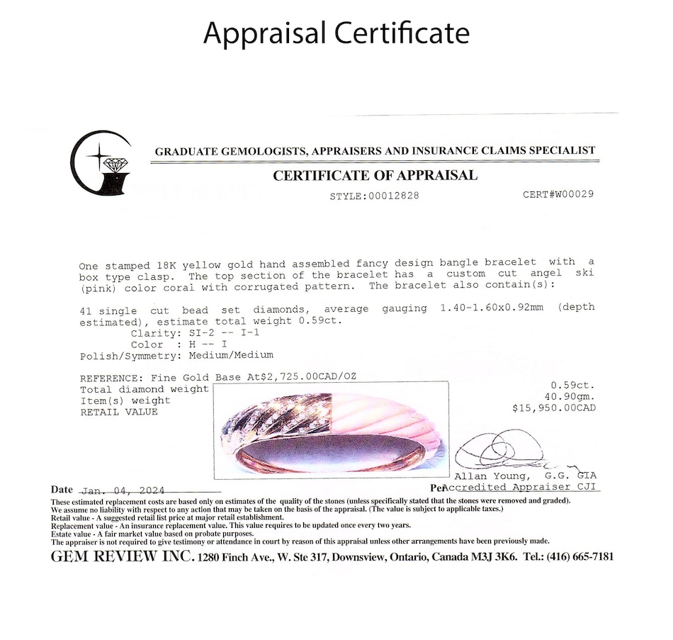 • Specifications: (1) custom cut angel skin coral, (41) round shaped diamonds (0.59 av. ctw)