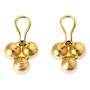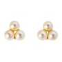 These classically designed earrings each feature three 8.5mm-8.6mm round shaped cultured pearls, arranged in a triangular presentation. The surprise element is that each of the pearls are bezel set, in the middle, with a diamond creating a high end appeal. Each pearl is peg-mounted in an individual 18K yellow gold cup with attached omega back, for non-pierced ears.