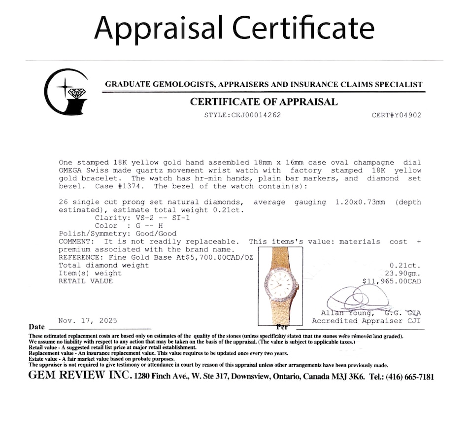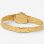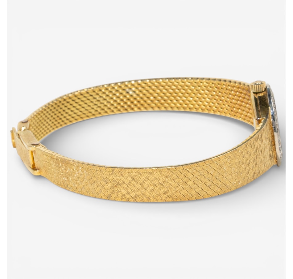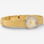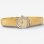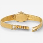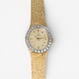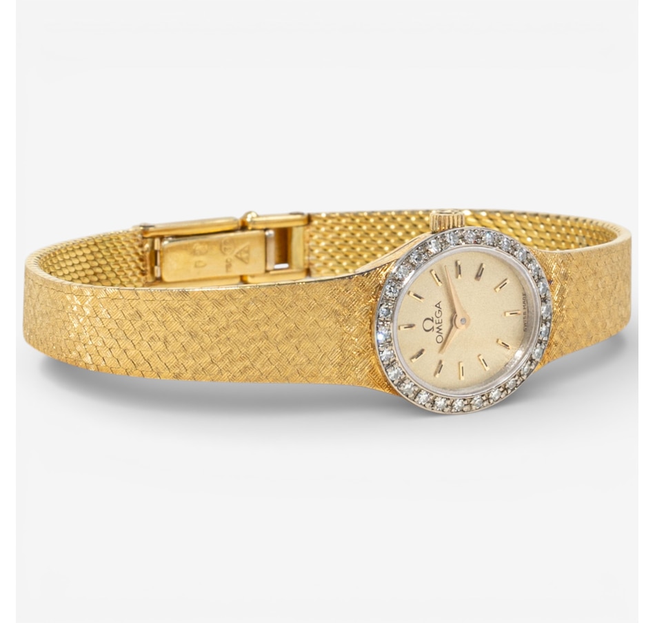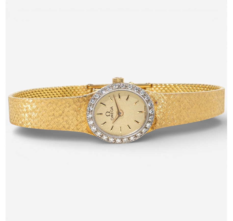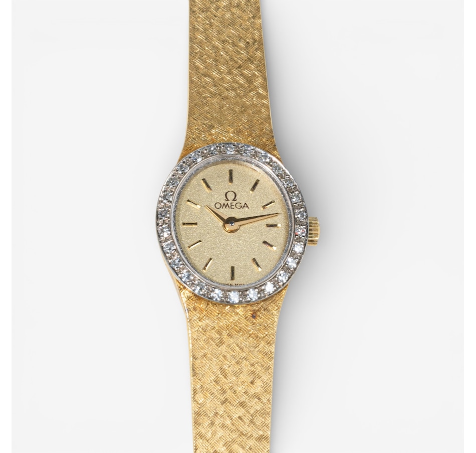 This sleek and sophisticated ladies’ yellow gold Omega watch exemplifies the timeless elegance and precision for which the brand is renowned. The design centres on an 18 mm x 16 mm oval champagne-coloured dial, its warm hue complemented by raised gold-tone stick hour markers that provide clean, understated legibility. Surrounding the dial is a luminous white gold bezel set with 26 sparkling diamonds, adding a graceful touch of brilliance without overpowering the watch’s refined silhouette.