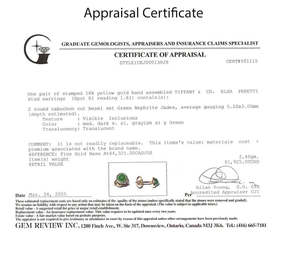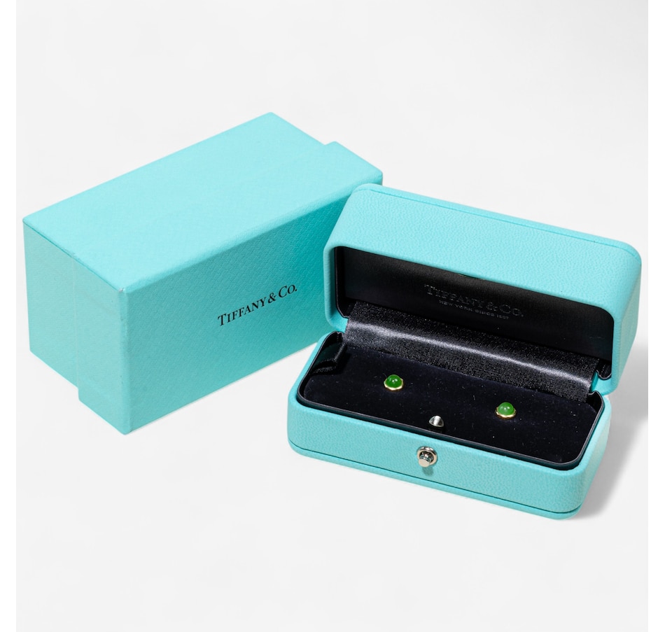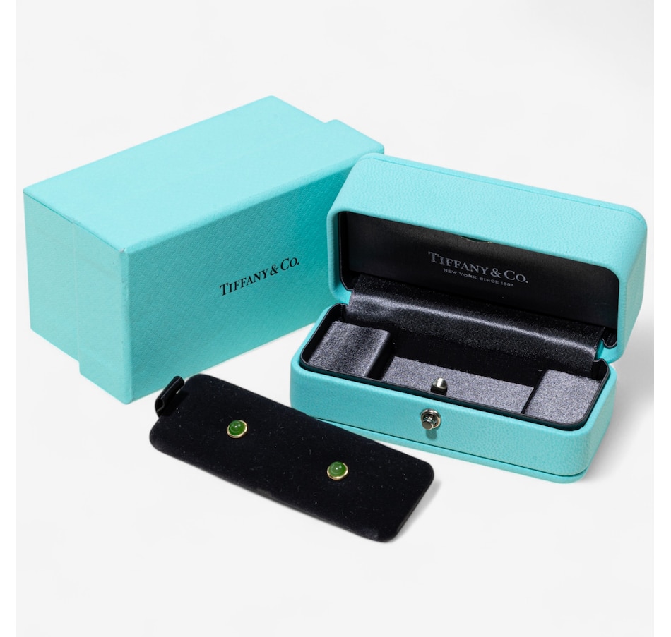 These Elsa Peretti for TIFFANY & Co. earrings are rendered in 18K yellow gold with 7mm green jade cabochons. The original design is copyrighted by the Nando and Elsa Peretti Foundation and currently retails at Tiffany for $2,250.00. They come with the original Tiffany blue box.