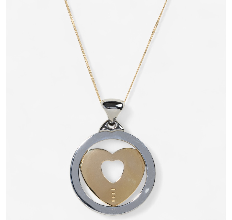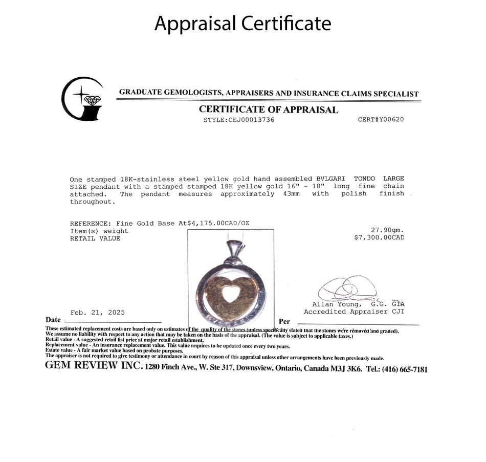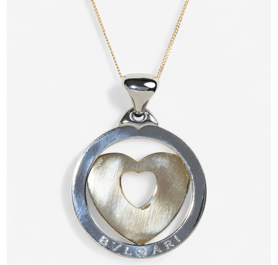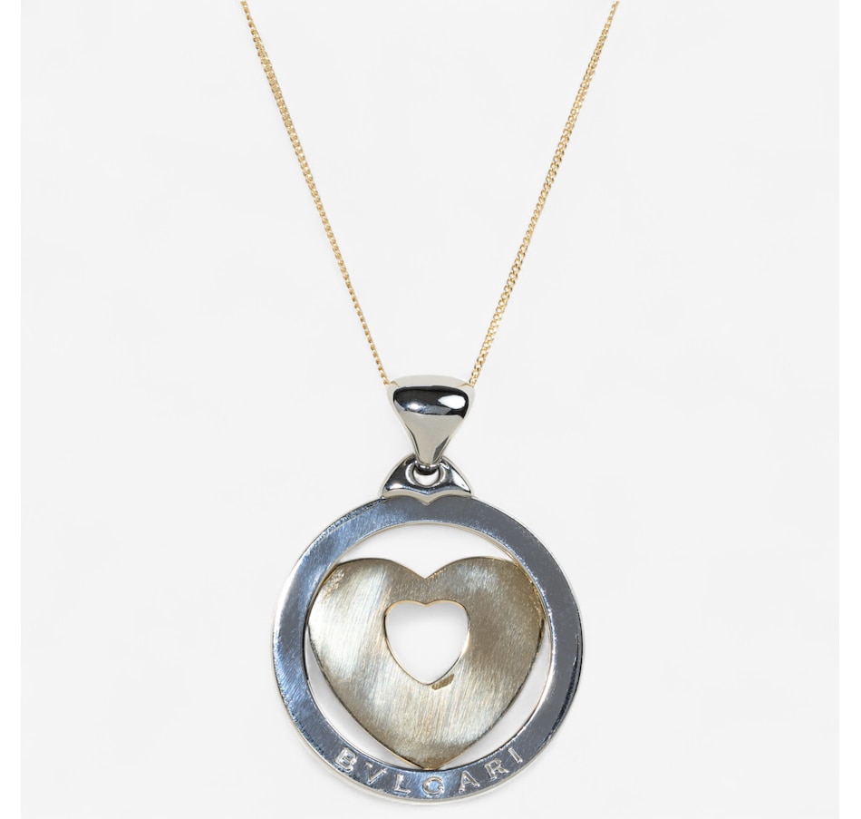 This designer Tondo Large Heart pendant, by BVLGARI, is crafted in warm 18K yellow gold and stainless-steel. It features a stainless steel circular border, signed BVLGARI, with a large, rounded bale. Within the circle is a yellow gold heart with a second heart cutout in the middle. An adjustable 16 - 18"" curb link chain with lobster clasp is included.