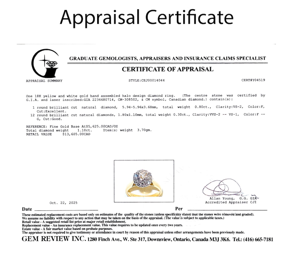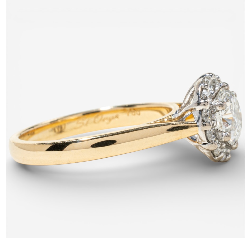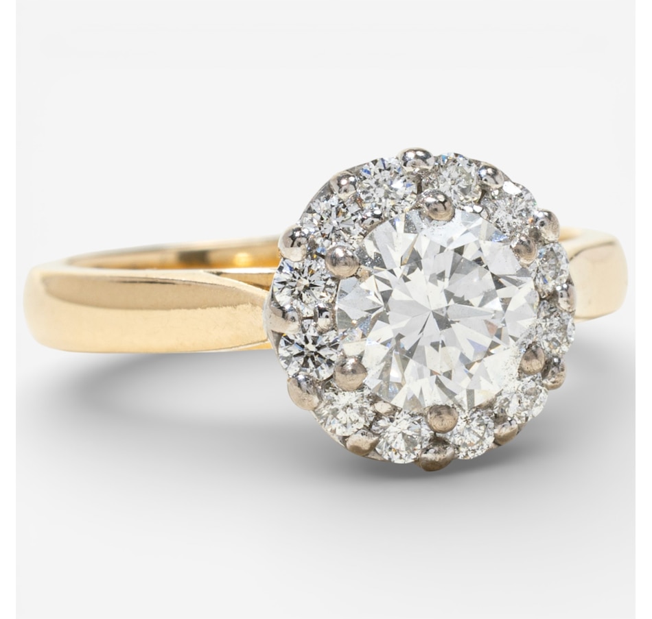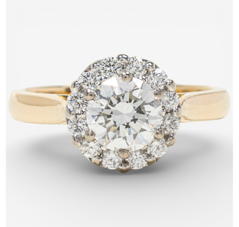 This exquisite 18K halo design diamond ring features a stunning 0.80 carat round brilliant cut Canadian diamond at its centre, elegantly surrounded by a halo of twelve round brilliant cut diamonds totalling 0.30 carats, for a combined total diamond weight of 1.10 carats.