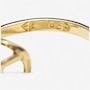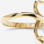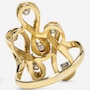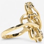 This sophisticated yellow gold ring features an intricate design of three interwoven infinity-shaped swirls, forming a striking and symbolic composition. Each stylized figure-eight motif is oriented vertically (north/south), representing endless continuity and timeless elegance. Nestled within the open cups at both the top and bottom of each infinity loop are six round brilliant cut diamonds, prong-set in white gold to enhance their sparkle and contrast beautifully against the warm yellow gold. Together, these diamonds add a touch of refined brilliance to the flowing design.