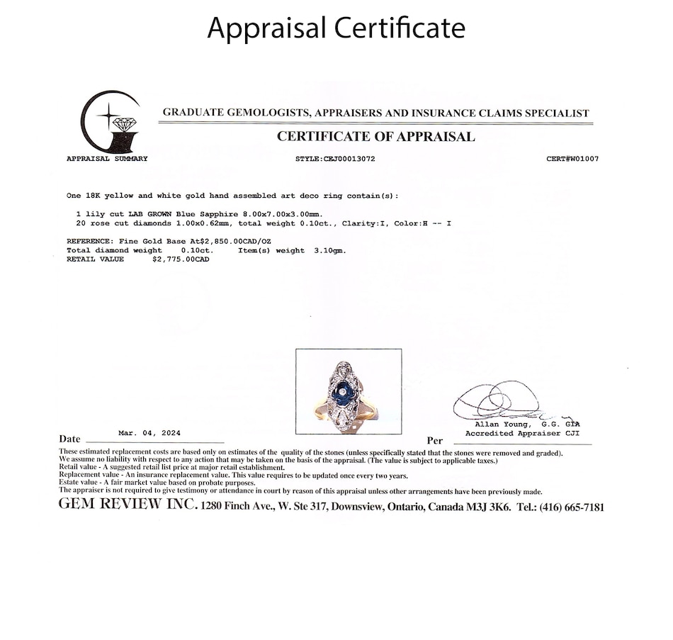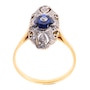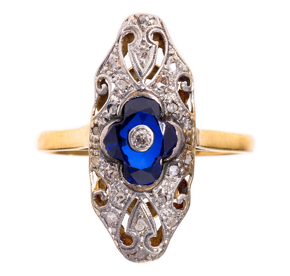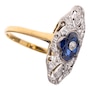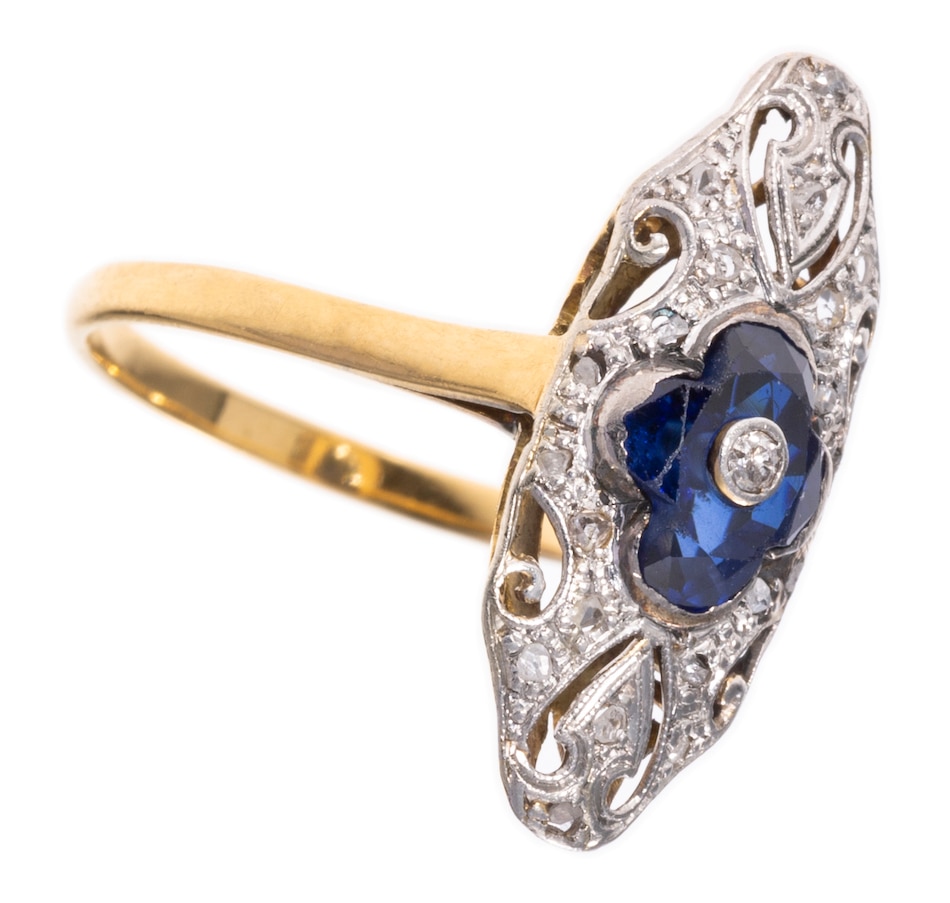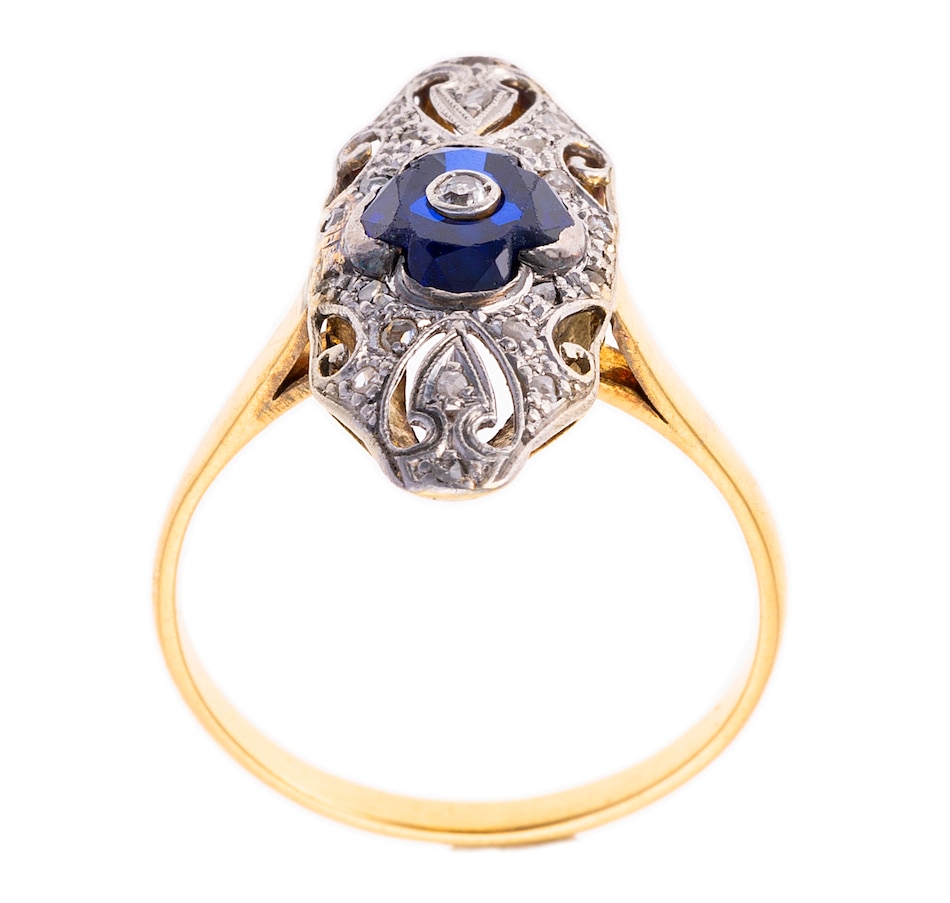 This Art Deco designed ring was custom crafted in 18K yellow and white gold between 1930 and 1935. It features an 8.00mm x 7.00mm x 3.00mm lily cut lab grown sapphire at its centre. Bezel-set in the middle of the sapphire is a rose cut diamond. An additional twenty rose cut diamonds decorate the white gold elongated, octagonal pierced setting. A yellow gold pierced foliate undergallery supports the top in a boat-like fashion.