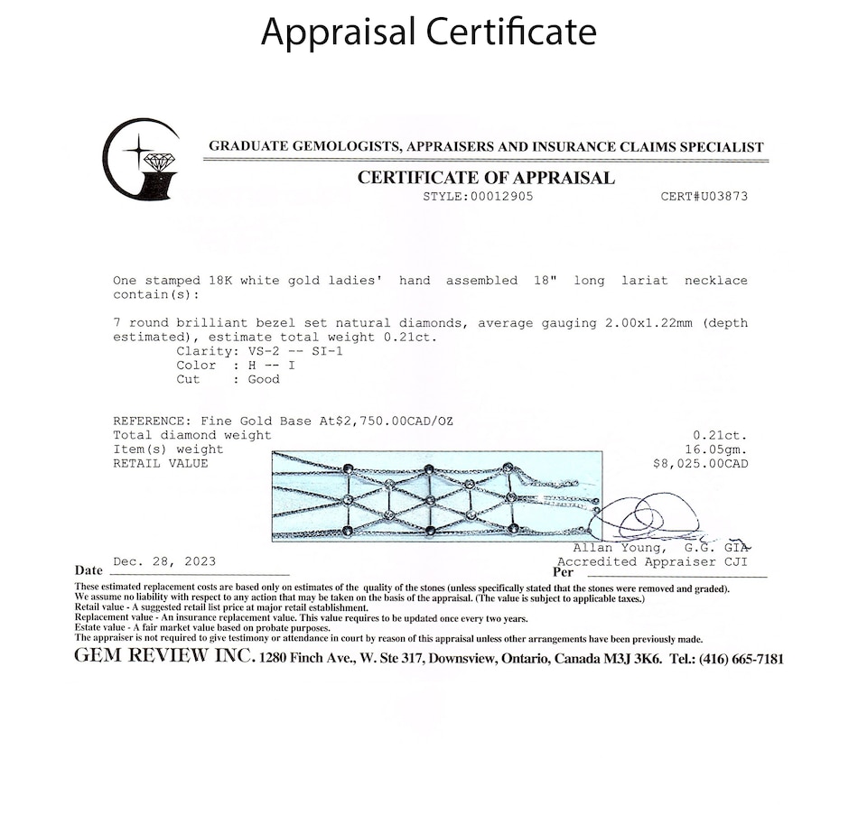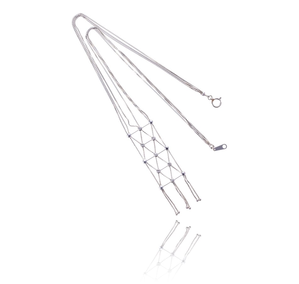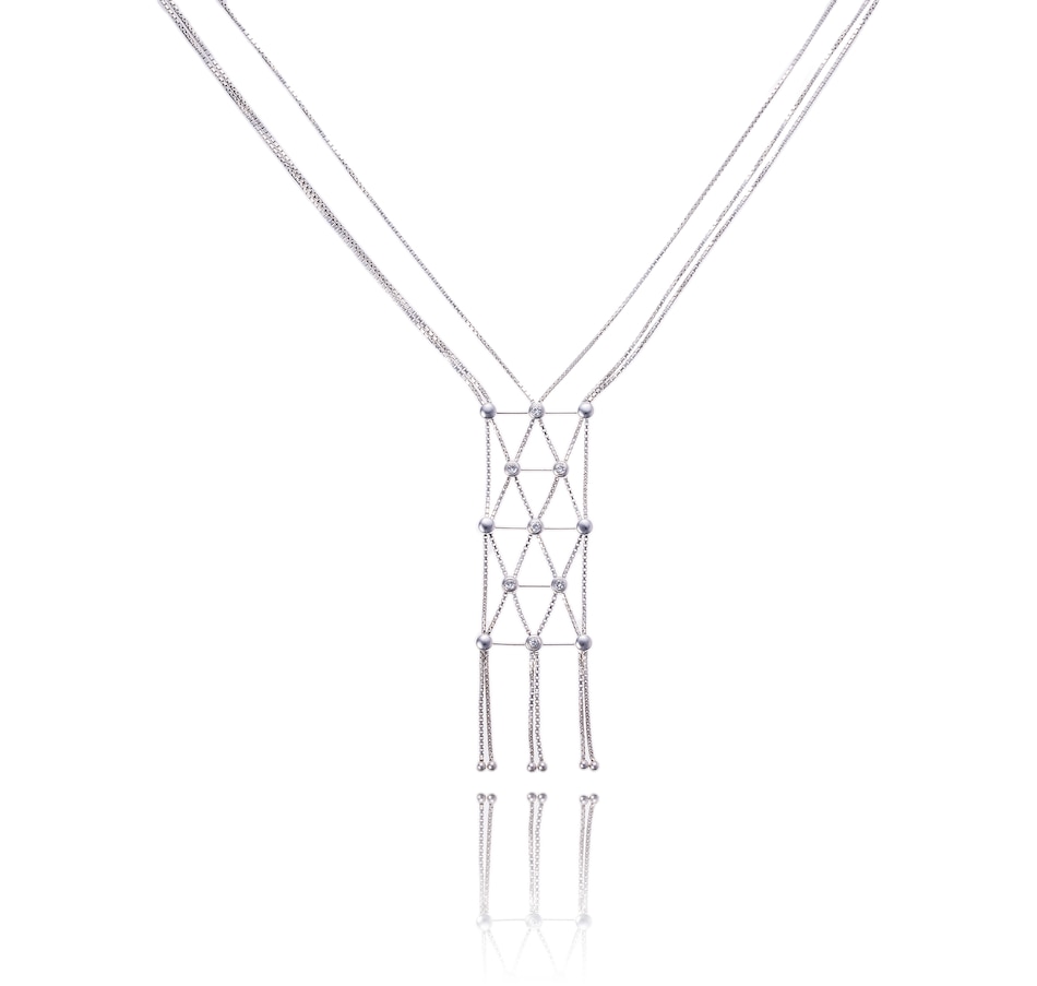 This striking necklace is designed in a lariat style with six box link chains that attach to either side of a large spring ring clasp. The chains drop approximately 19" to attach, in three places, to the flexible spider web elongated centerpiece. Three long bars and two short bars run horizontally across as they secure and hold an open argyle pattern in place. Seven of the buttons on the bars contain a bezel-set diamond and six of the chains drop, in pairs, from the bottom providing a fringe effect.