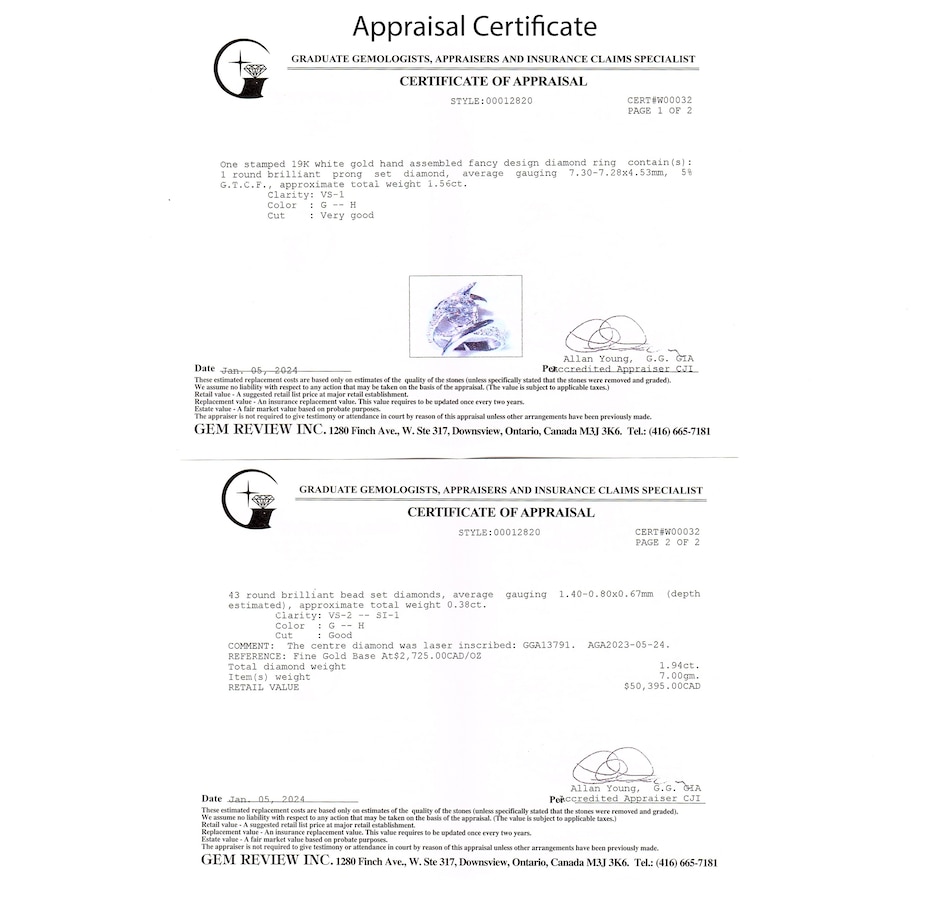 • Specifications: (1) round brilliant cut diamonds (1.56 av. ctw), and (43) round brilliant cut diamonds (0.38 av. ctw)