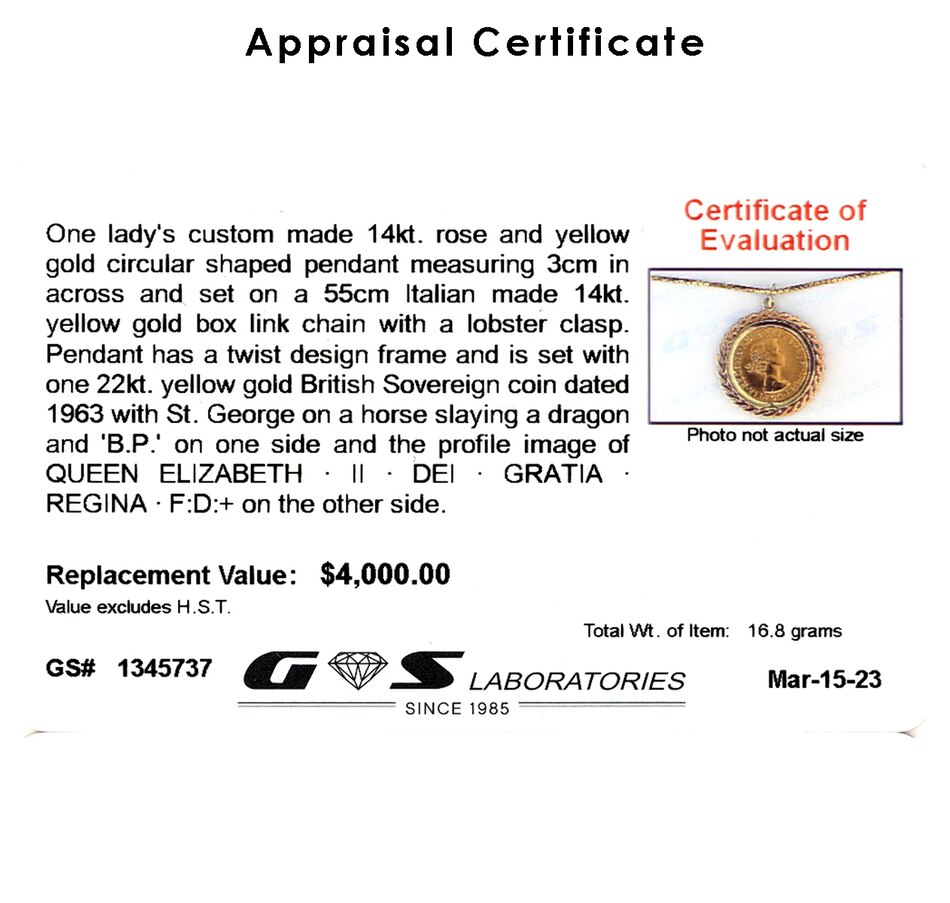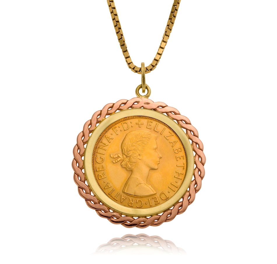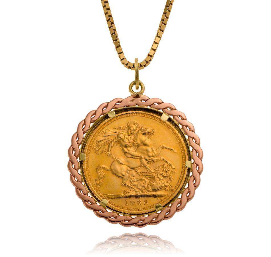 This pendant is custom crafted in 14K yellow and rose gold. It features a 22K gold British Sovereign coin, dated 1963. The reverse (which faces down) features the famous St. George on a horse slaying a dragon design, engraved by Benedetto Pistrucci; the obverse (facing up) illustrates the young head of Queen Elizabeth as designed by Mary Gillick and reads "Queen Elizabeth II Dei Gratia Regina F:D: ." The coin is prong-set from behind and bezel set in yellow gold on the front. A rose gold 'S' design border surrounds the bezel. An oval bale is at the top and a 22" box link chain with lobster clasp is included. The 1963 Gold Sovereign is one of the most ubiquitous of all coins, and much sought after by both coin collectors and bullion investors. Sovereigns have been minted since 1817 (in Britain 1817-1917, 1925 and 1957 on). At coin fairs you often hear the dealers refer to these coins as "Sovs."