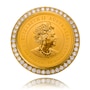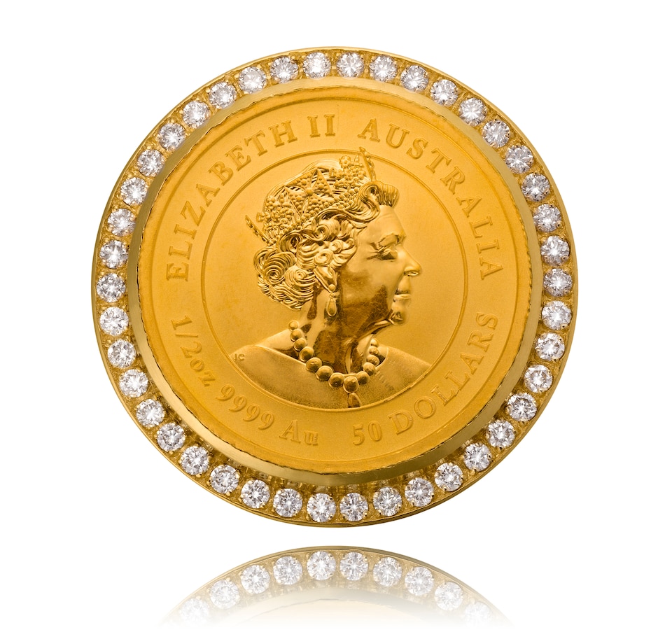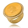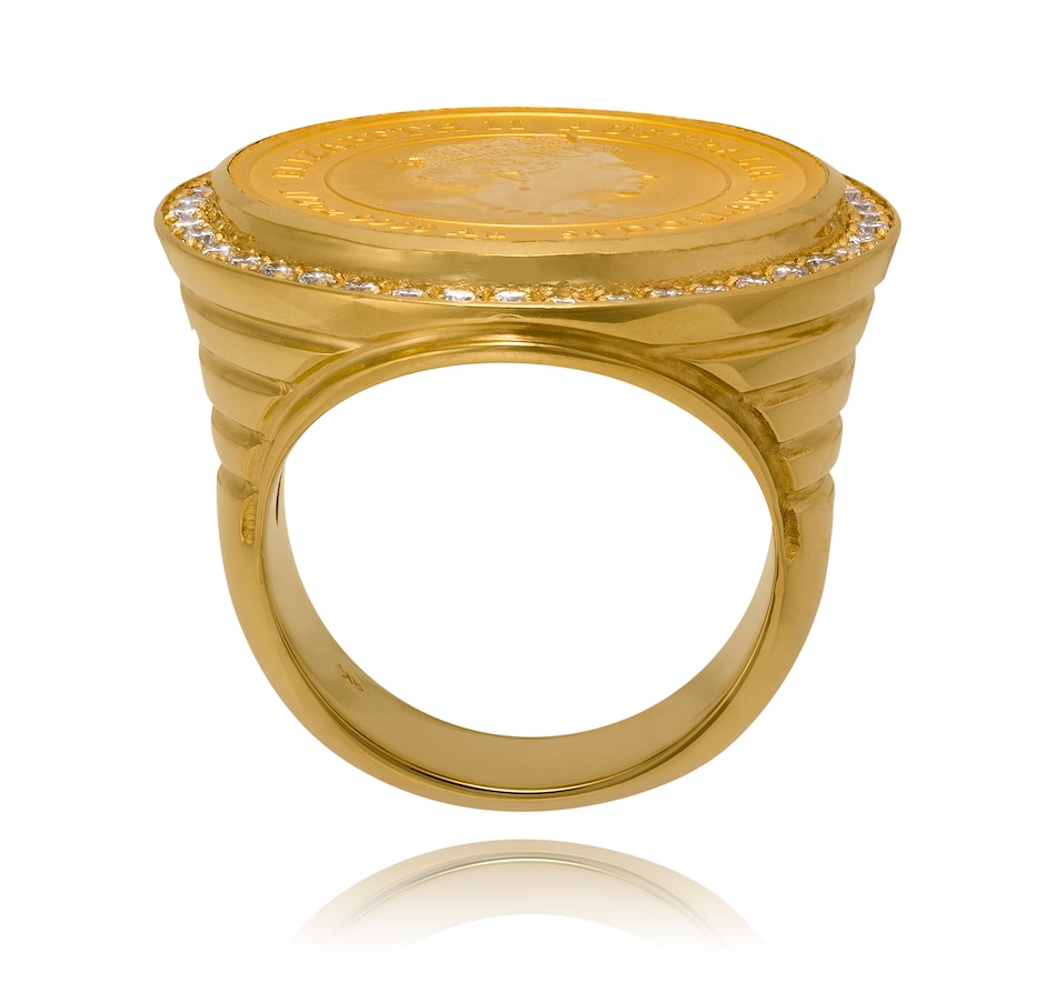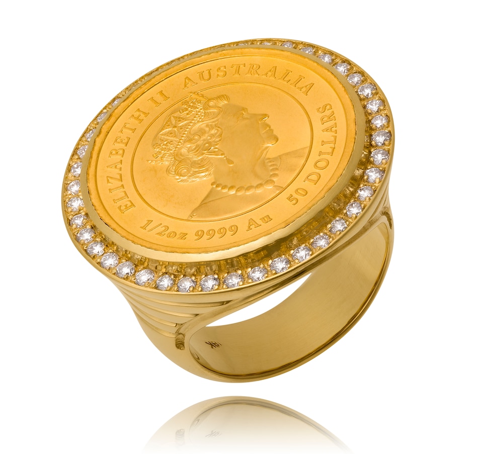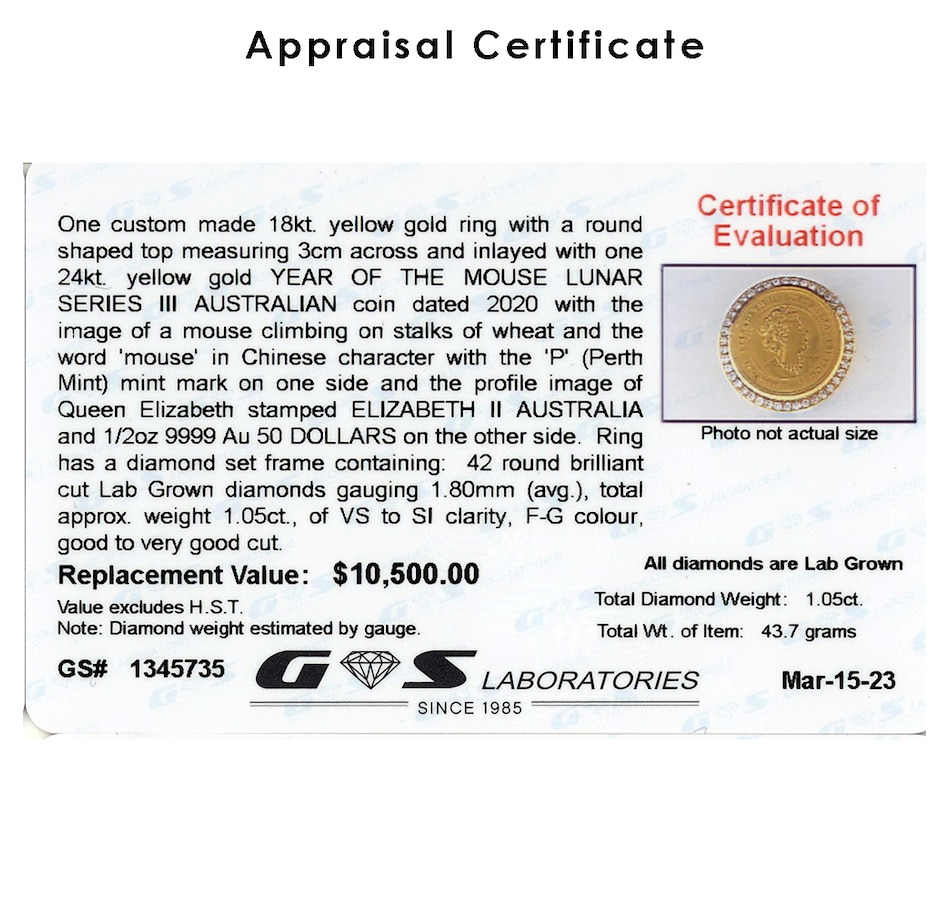 This outstanding ring is custom crafted in 18K yellow gold and is inlayed with a 24K yellow gold Year Of The Mouse Lunar Series III Australian coin, dated 2020 with the image of a mouse climbing on stalks of wheat and the word 'mouse' in Chinese characters. The 'P' (Perth Mint) mint mark is on one side and the profile image of Queen Elizabeth stamped "Elizabeth II Australian" and "1/2oz 9999 Au 50 Dollars" on the side facing up. The ring has a large diamond-set frame, prong-set with forty-two round brilliant cut lab grown diamonds, combining for 1.05 carats. The shoulders of the ring are deeply grooved with a horizontal tapered design and the inside of the ring is finished with a concave backing with a pierced floral design.