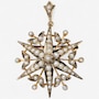 This celestial beauty is dotted with thirty lustrous tiny seed pearls on its graceful rays, five per ray. Between rays are tulip style florettes, each one set with three seed pearls. The raised centre holds another pearl and the bale, an additional two pearls for a total of fifty-one. The brooch/pendant is hand fabricated in 9k yellow gold (assayed in Birmingham, England) and hails from the Victorian period (circa 1857) and will make a stellar statement at your neckline or wherever you choose to pin it.