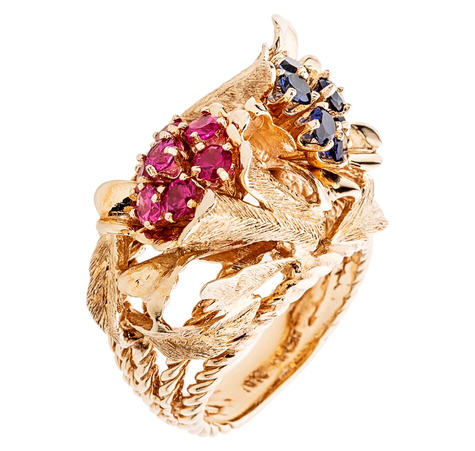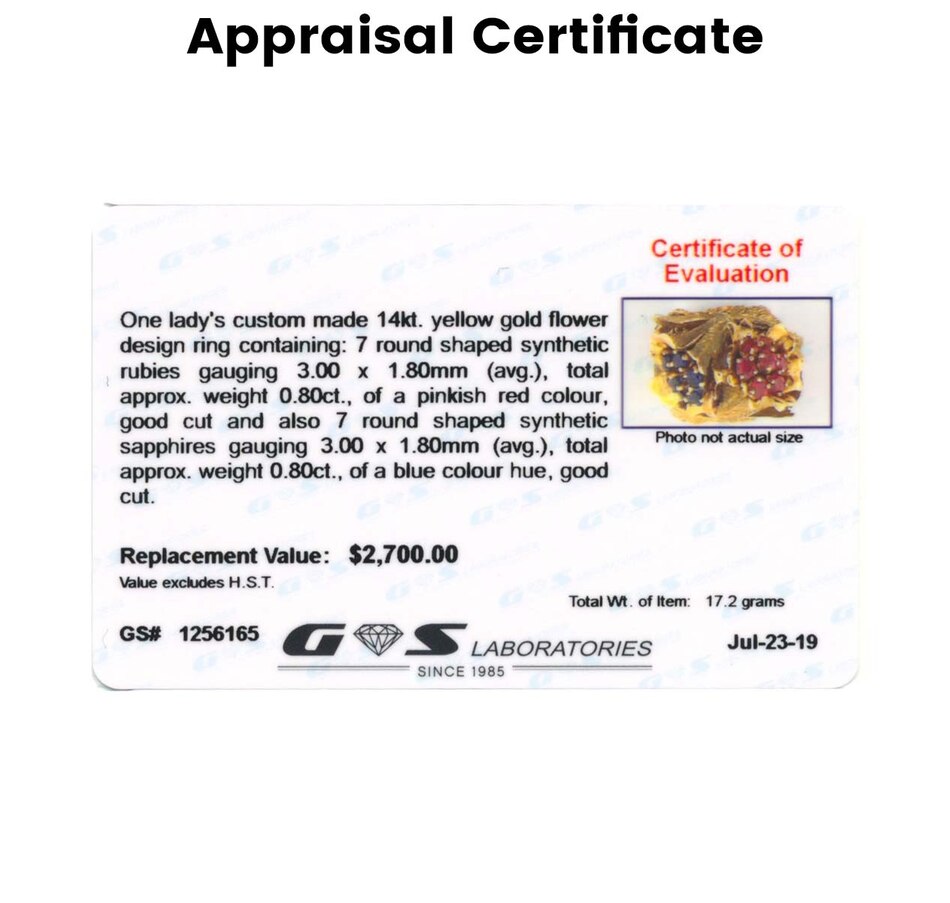 • (7) round synthetic rubies (0.80 ctw), (7) round synthetic sapphires (0.80 ctw)