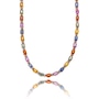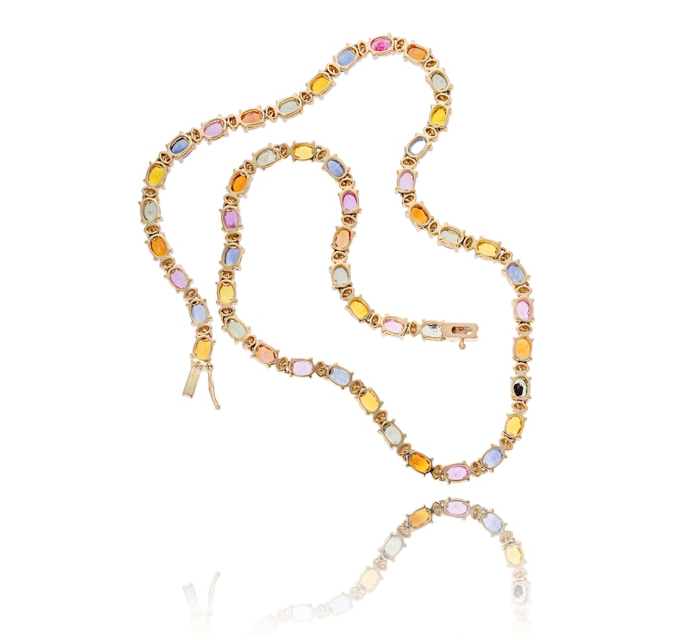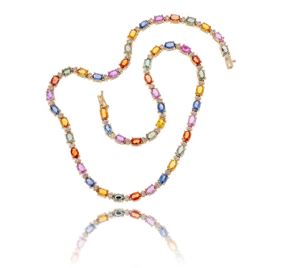 This colourful and cheerful 14K yellow gold custom-made necklace combines alternating multi-colour sapphires with diamonds in a 17.5" length. Each of the stones are prong set, and the forty-eight sapphires are oval in shape and display green, pink, yellow, orange, blue and fuchsia colours, combining to offer 27.61 carats. The forty-eight round brilliant cut diamonds contribute 1.44 carats in total. A hidden box clasp and safety secure the ends.