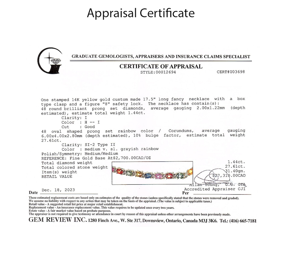 • Specifications: (48) oval shaped sapphires (27.61 av. ctw), (48) round brilliant cut diamonds (1.44 av. ctw)