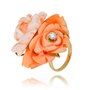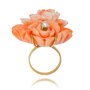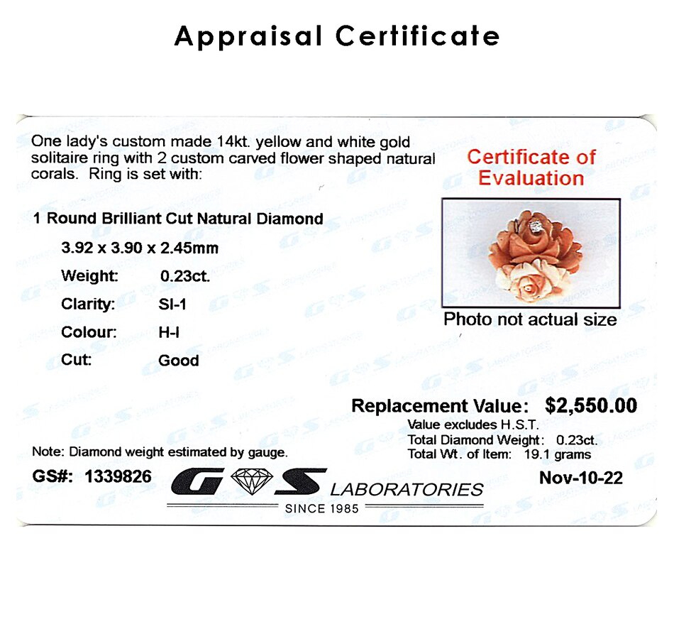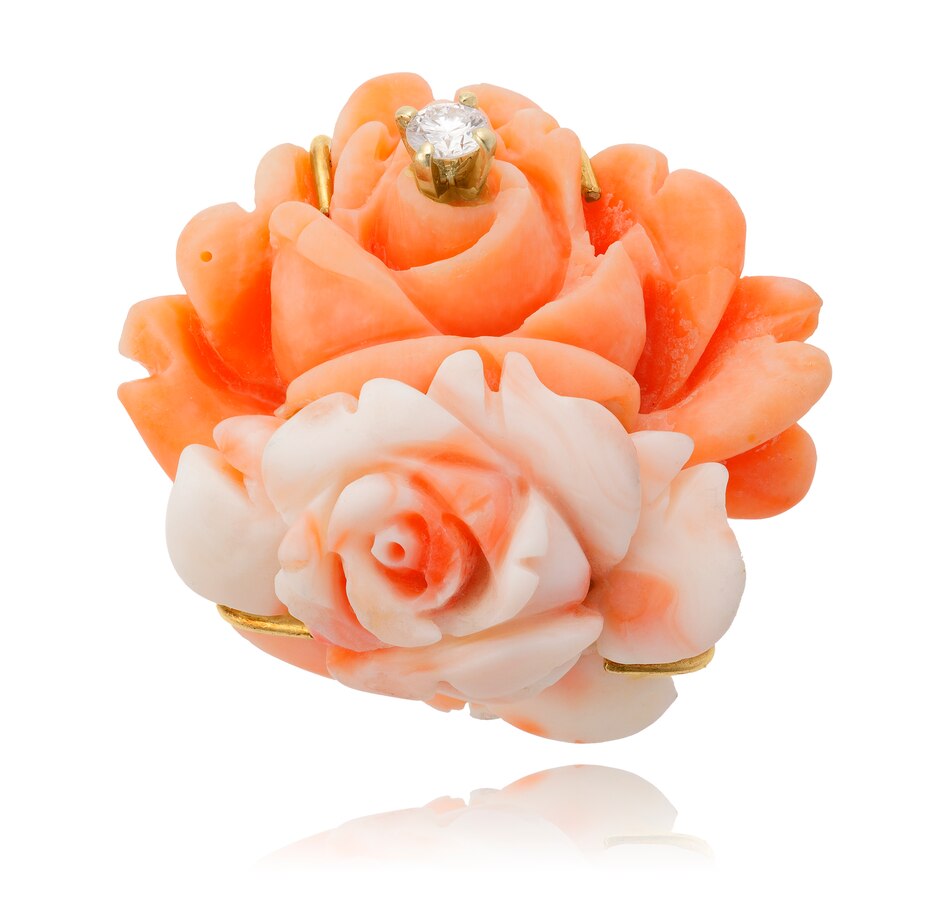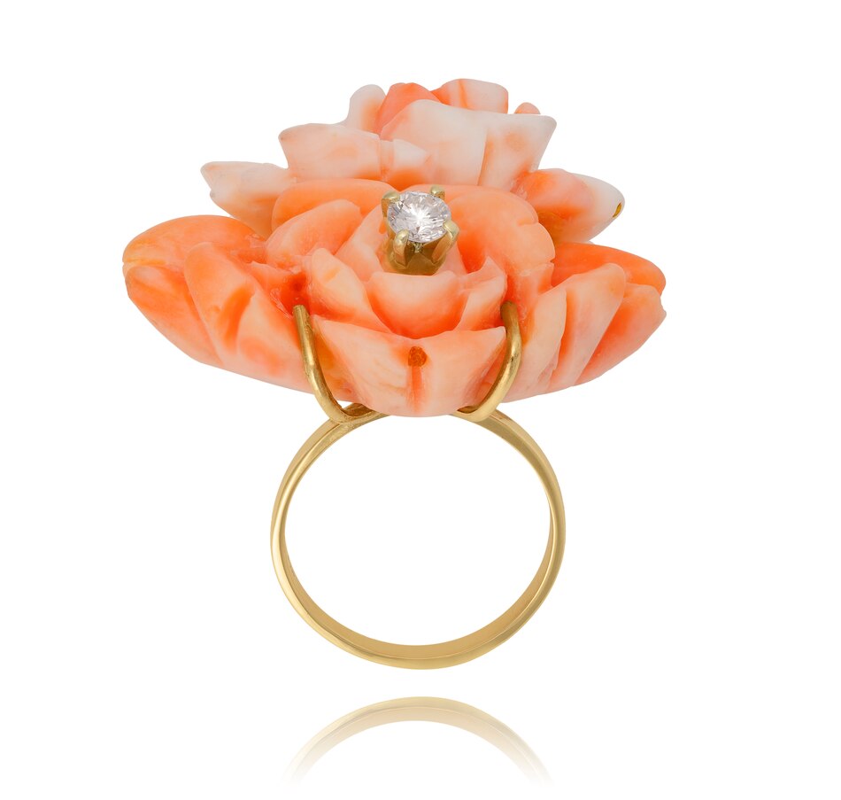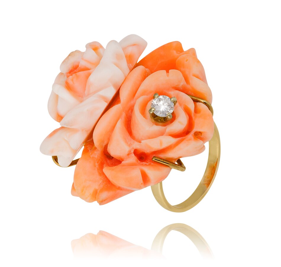 Custom Made 14K Yellow and White Gold Carved Coral Flowers and Diamond Ring