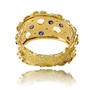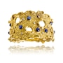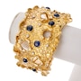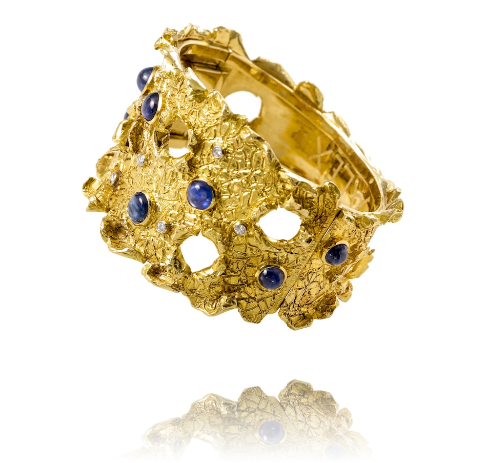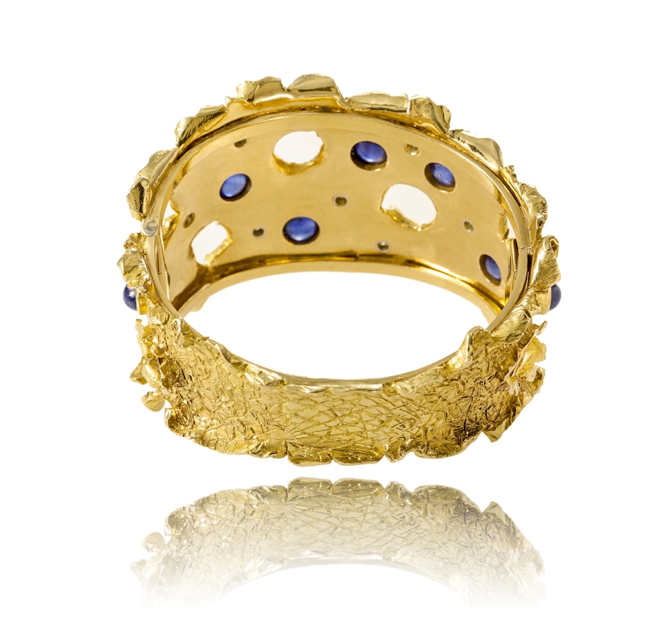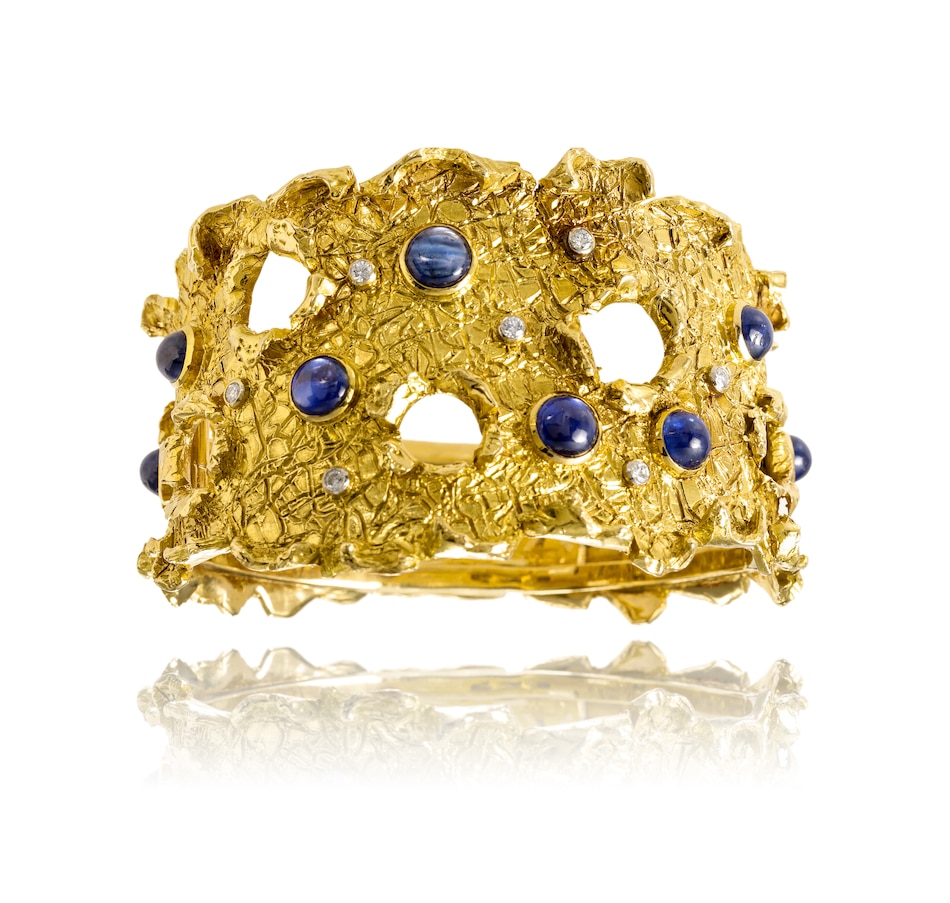 This incredibly unique and fabulous weighty bangle is custom-crafted in 18K yellow gold with rhodium enhancements around the diamonds. It measures approximately 4.5 cm in width across the front and tapers in a scalloped design to approximately 1.9 cm at the back. The entire surface has a cobblestone texture and the edges fold back in a curled fashion. The piece is pierced with seven circular openings, each displaying the same curled perimeter. Eight round cabochon-cut sapphires, each over a carat and a half, combine for 12.20 carats are bezel-set in a sporadic fashion across the front, with one serving to camouflage the hidden box clasp. Eight round, brilliant-cut diamonds, bezel-set in rhodium, are scattered across the top combining for a 0.35 carat total weight.