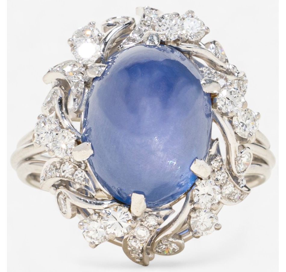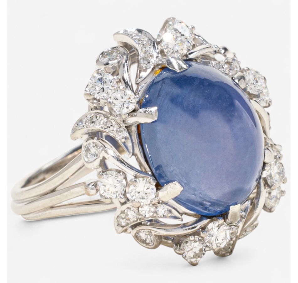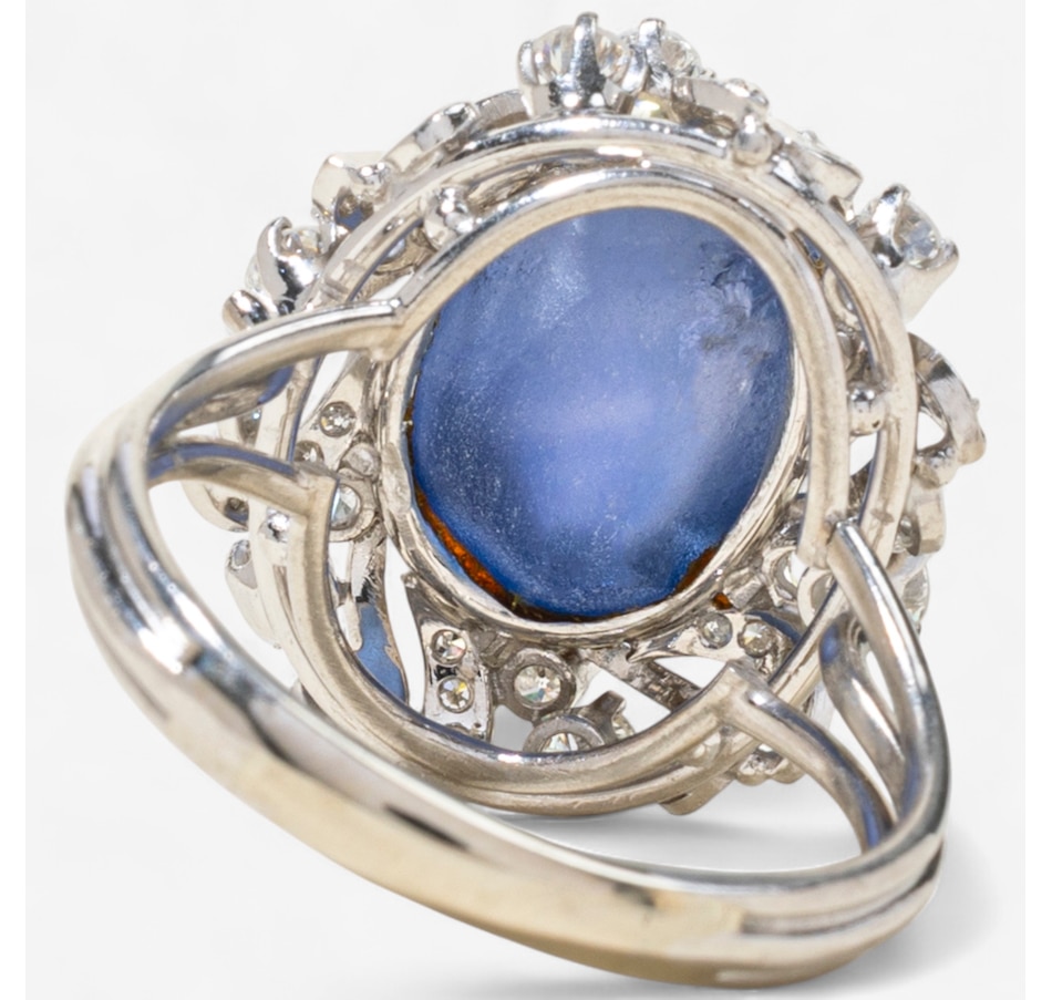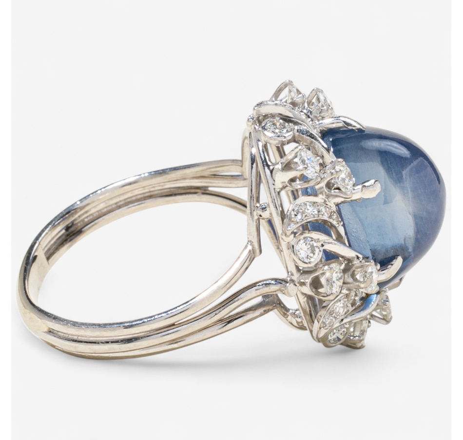 Custom Made Platinum 16.65 Carat Cabochon Cut Blue Star Sapphire and Diamond Ring