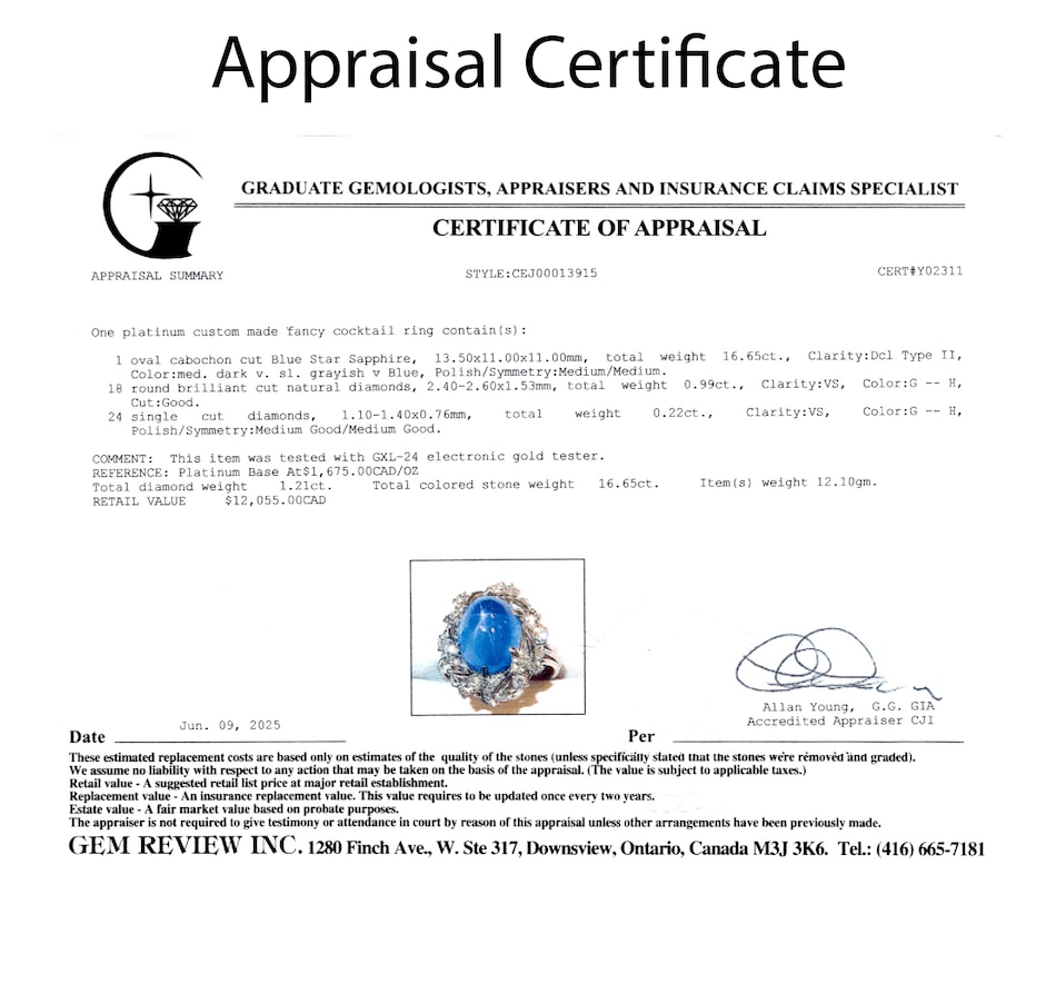 Crafted with precision and artistry, this custom-designed platinum ring centers on a truly exceptional gemstone: a mesmerizing natural blue star sapphire. Known for their captivating optical phenomenon called asterism, genuine star sapphires display a luminous, six-rayed star that shimmers across the surface of the stone when viewed under direct light. This rare effect is caused by fine needle-like inclusions of rutile within the sapphire—an unmistakable hallmark of authenticity and natural formation. Prong-set at the heart of the design, the cabochon-cut star sapphire glows with a velvety depth and celestial light, making it a true centerpiece of distinction.
