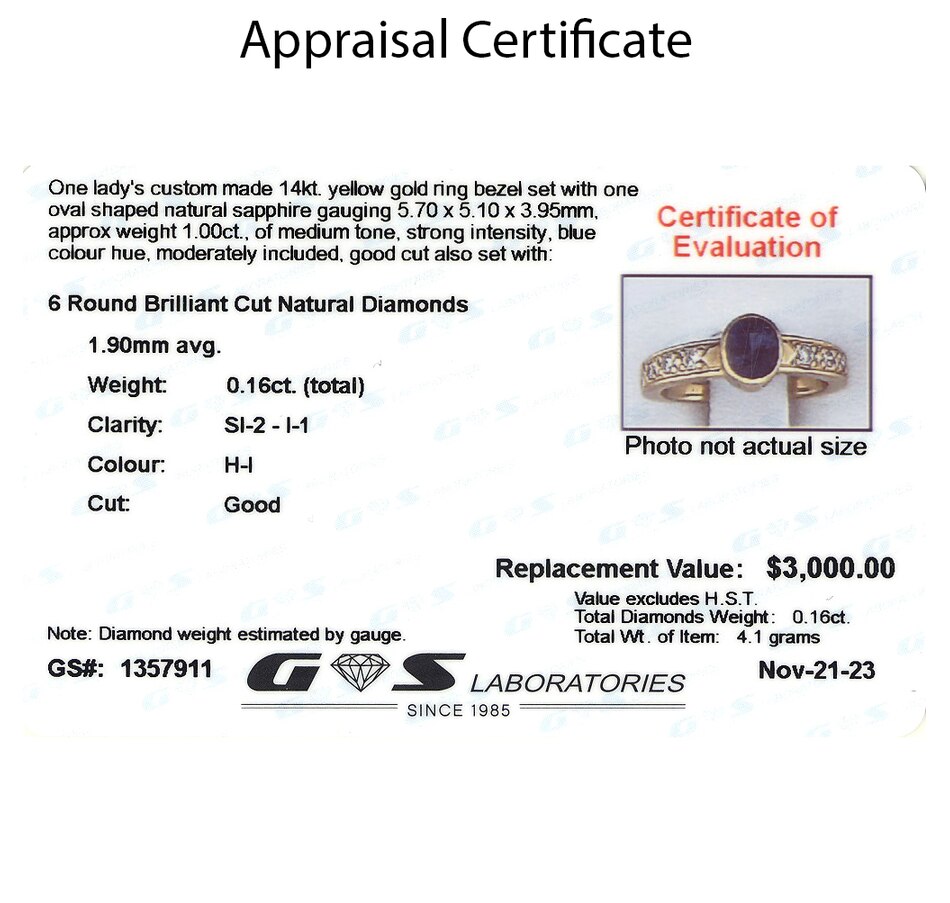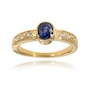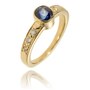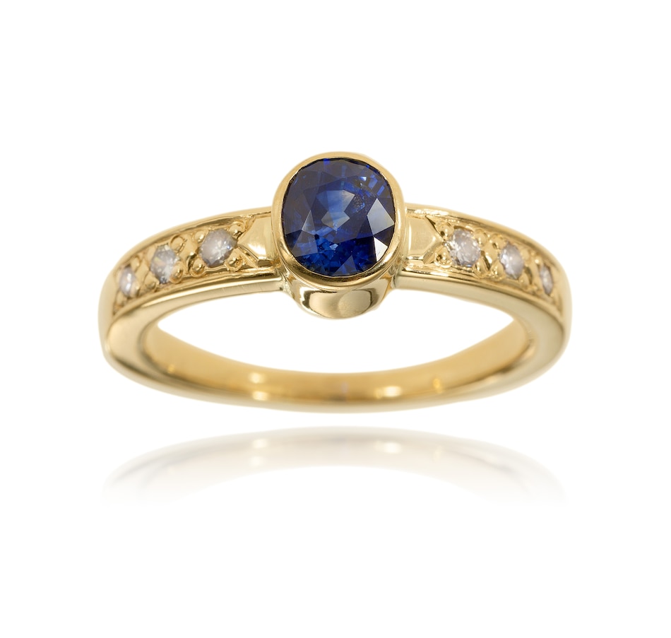 This simple yet elegant ring is custom-crafted in 14K yellow gold. It features a raised, bezel-set, 1.00-carat oval sapphire in the middle, and three round, brilliant-cut diamonds are set into each side of the patterned band and contribute 0.16 carats of lovely diamond sparkle.